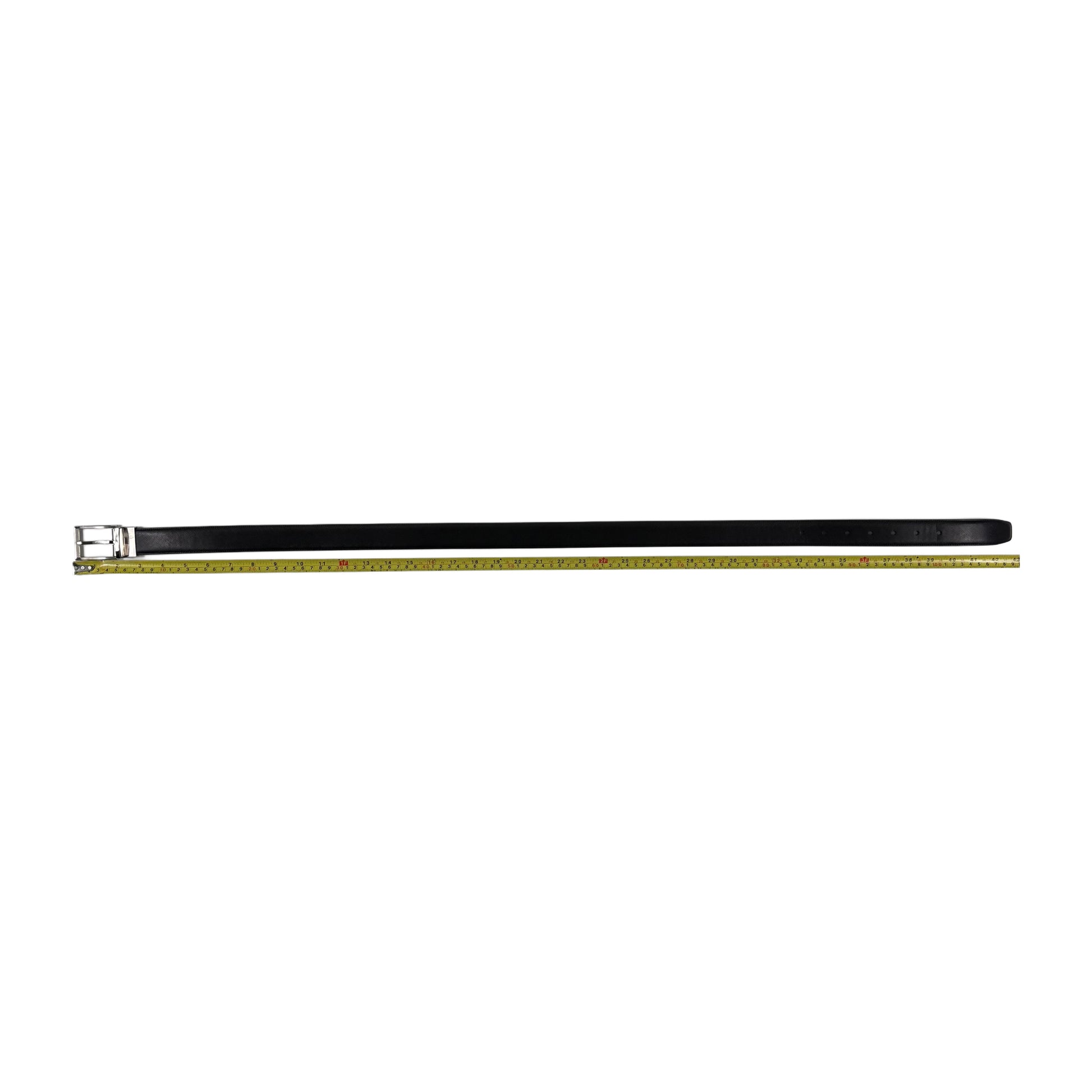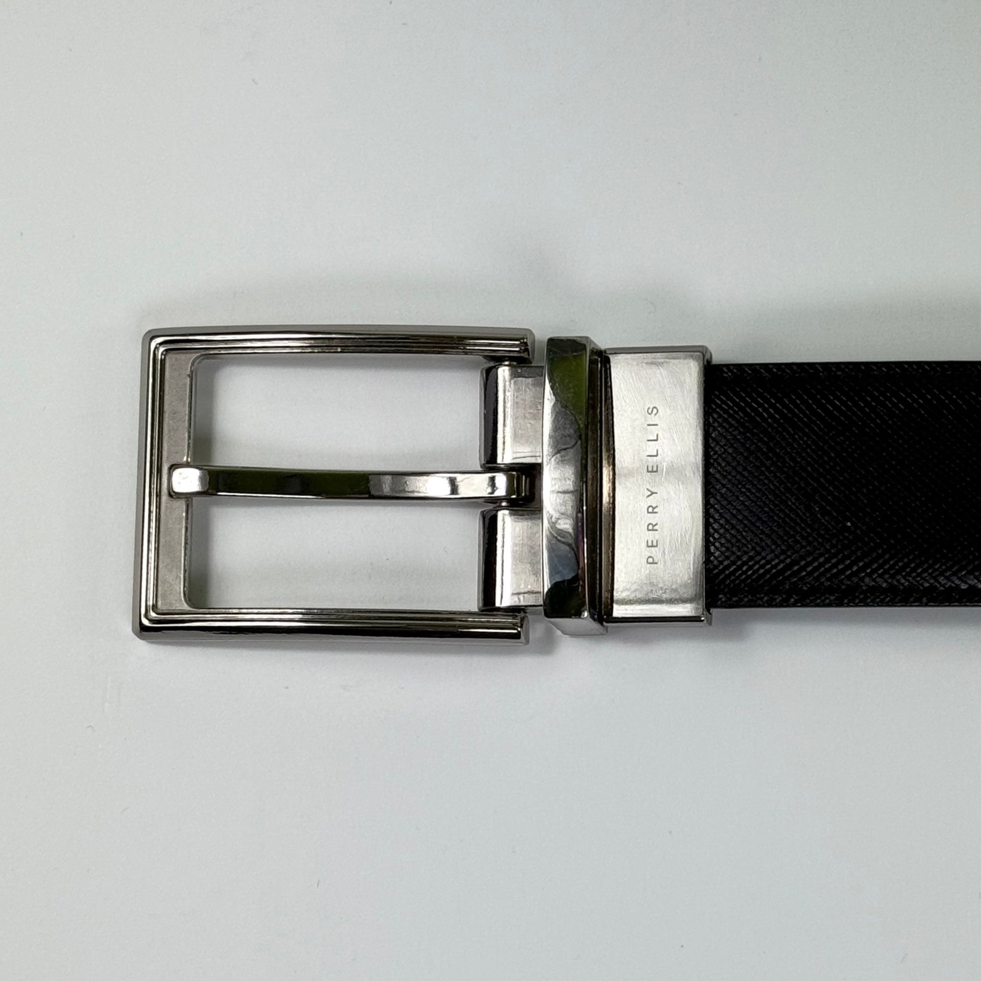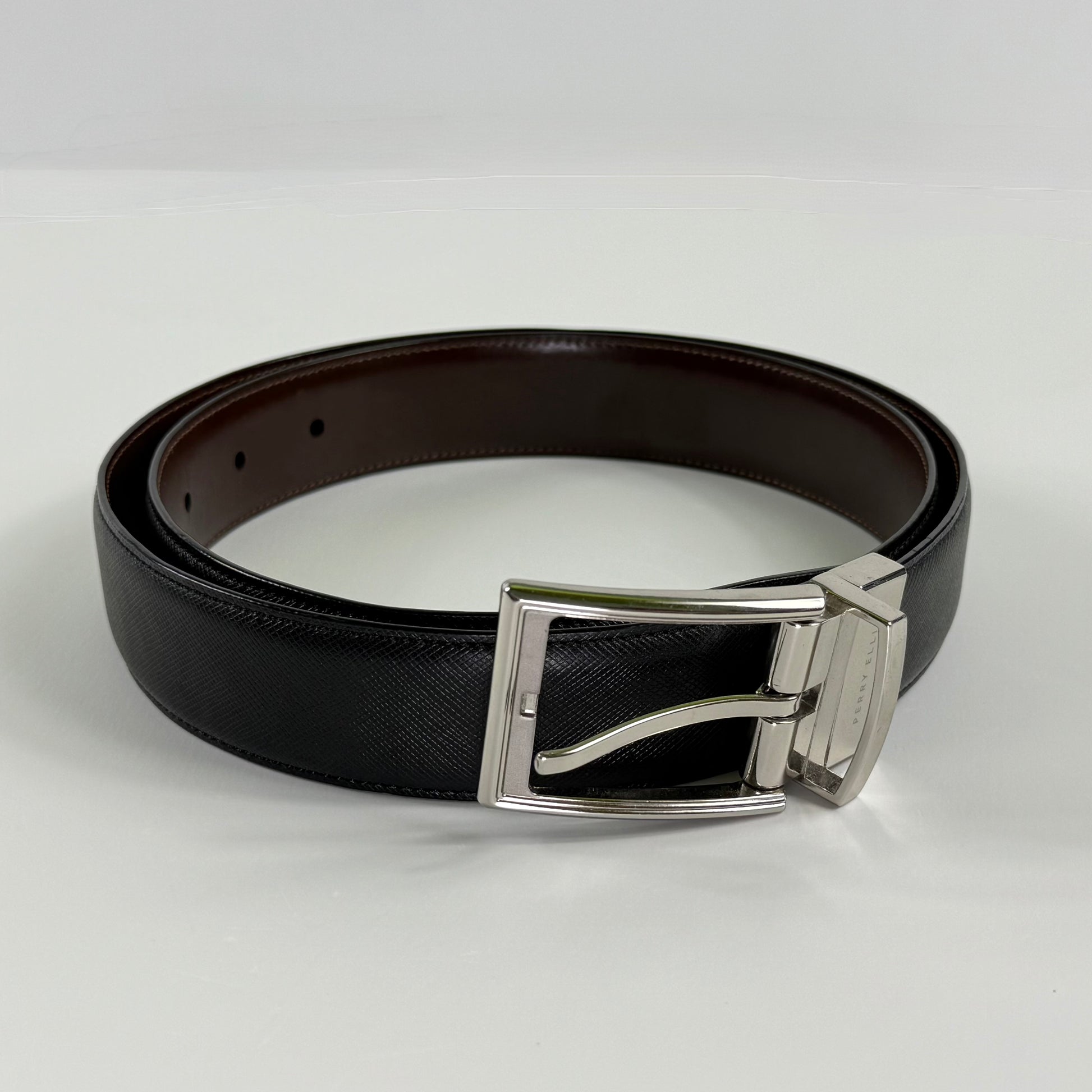 Cinturón reversible de Perry Ellis en cuero genuino, con hebilla metálica plateada y diseño texturizado tipo saffiano. Un accesorio versátil que ofrece dos colores en una sola pieza: negro por un lado y marrón por el otro.