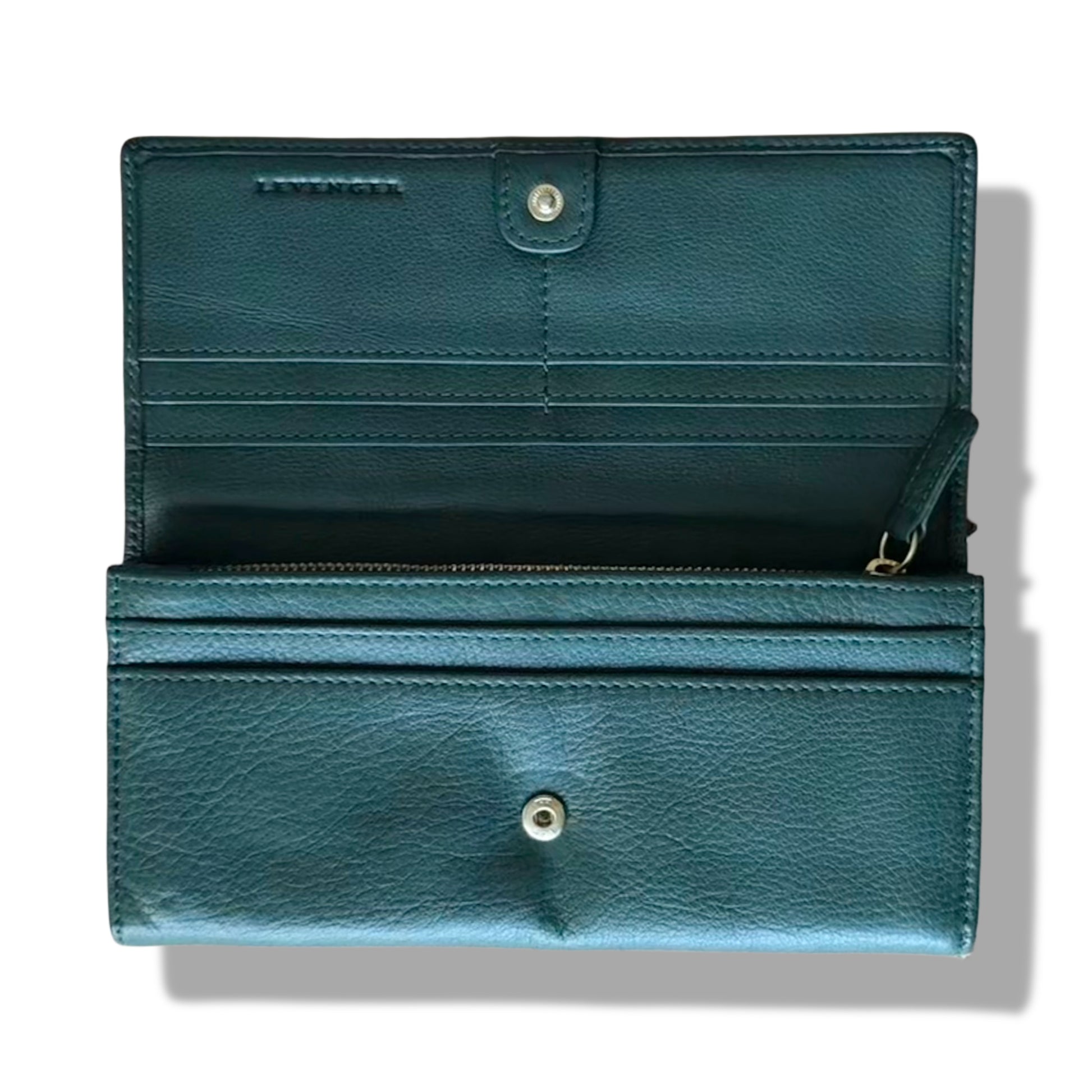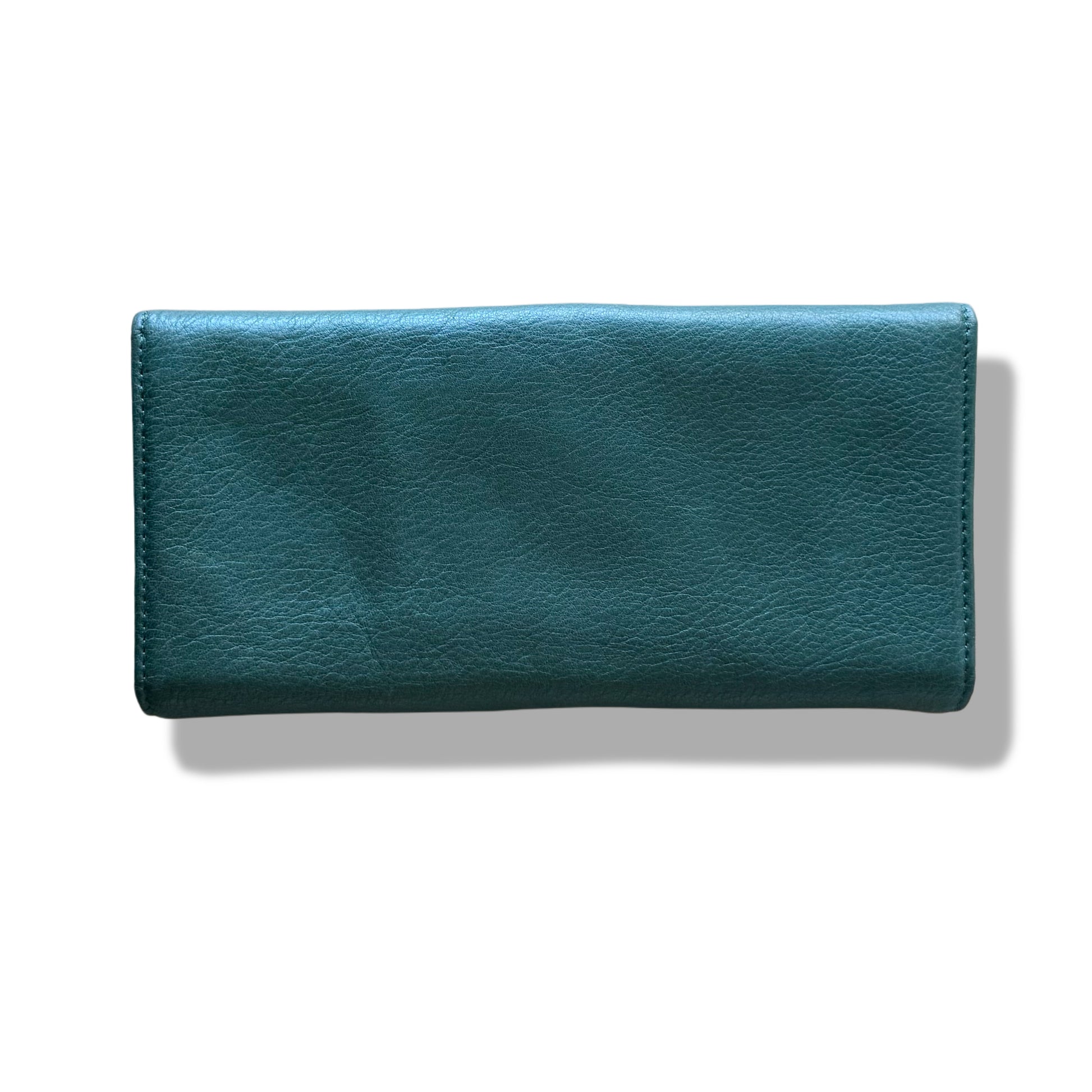 Billetera en piel genuina color verde oscuro con botón metálico dorado al frente. Diseño espacioso con múltiples ranuras internas, compartimento con zipper y acabado suave y flexible. Una pieza clásica y elegante, ideal para organizar tarjetas, efectivo y documentos sin perder estilo.