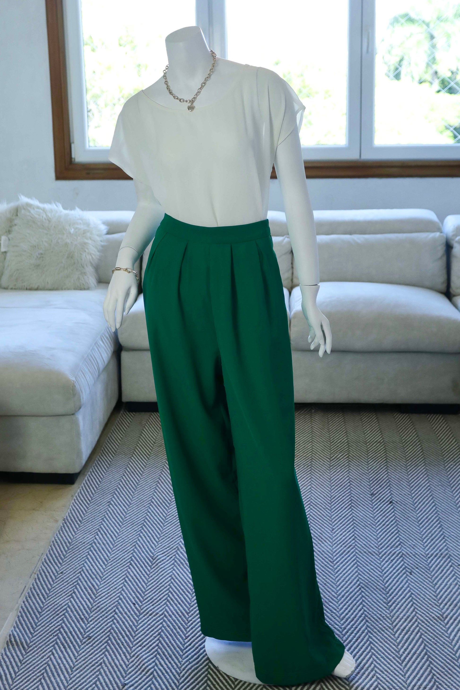 Pantalón palazzo verde de tiro alto que combina elegancia y comodidad. Confeccionado en tela ligera y fluida, presenta pliegues frontales y una silueta wide leg que favorece cualquier tipo de cuerpo. Perfecto para looks de oficina sofisticados o eventos especiales. Marca HFYE, talla S. Pieza única en excelente estado con mínima imperfección visible. Envío disponible en toda la República Dominicana.