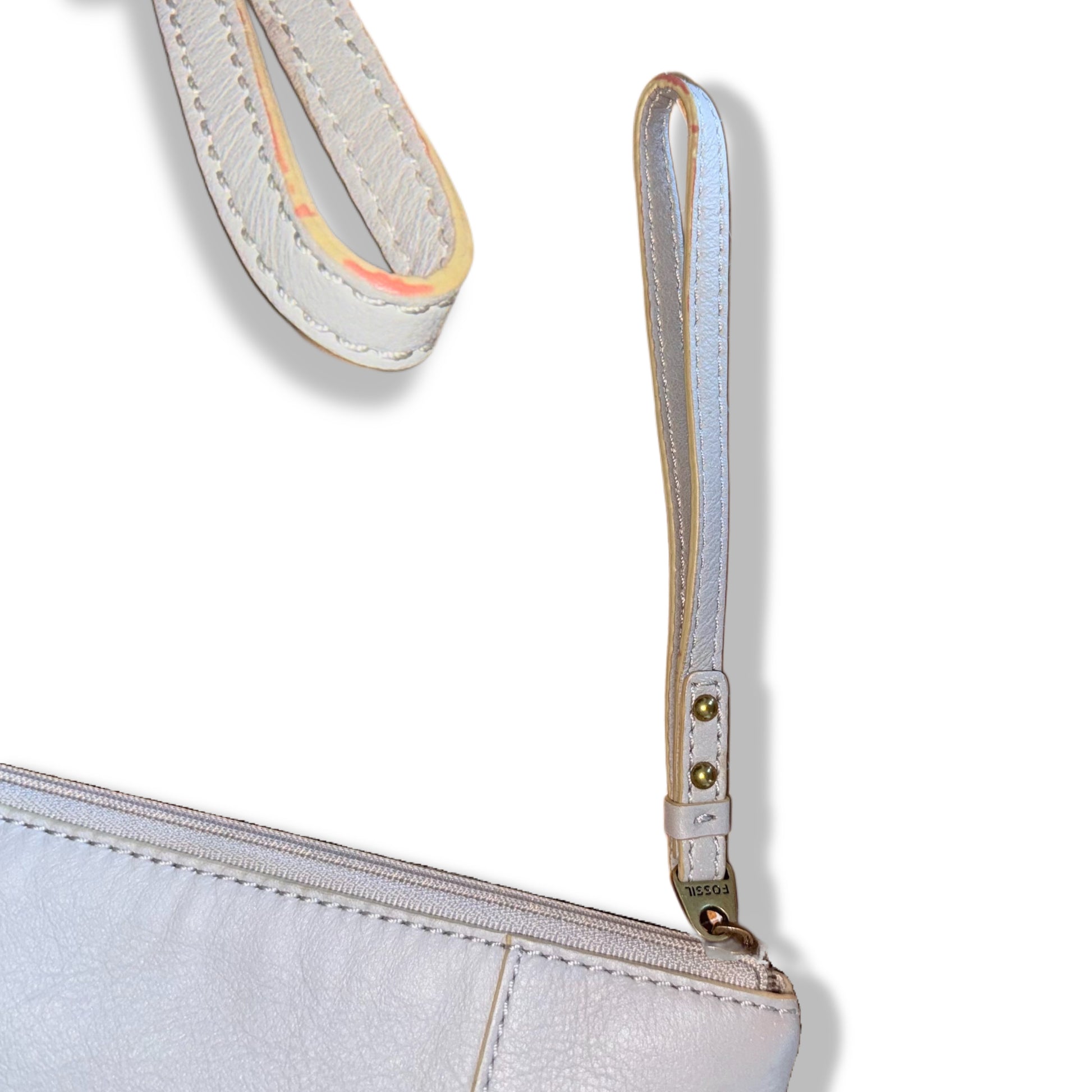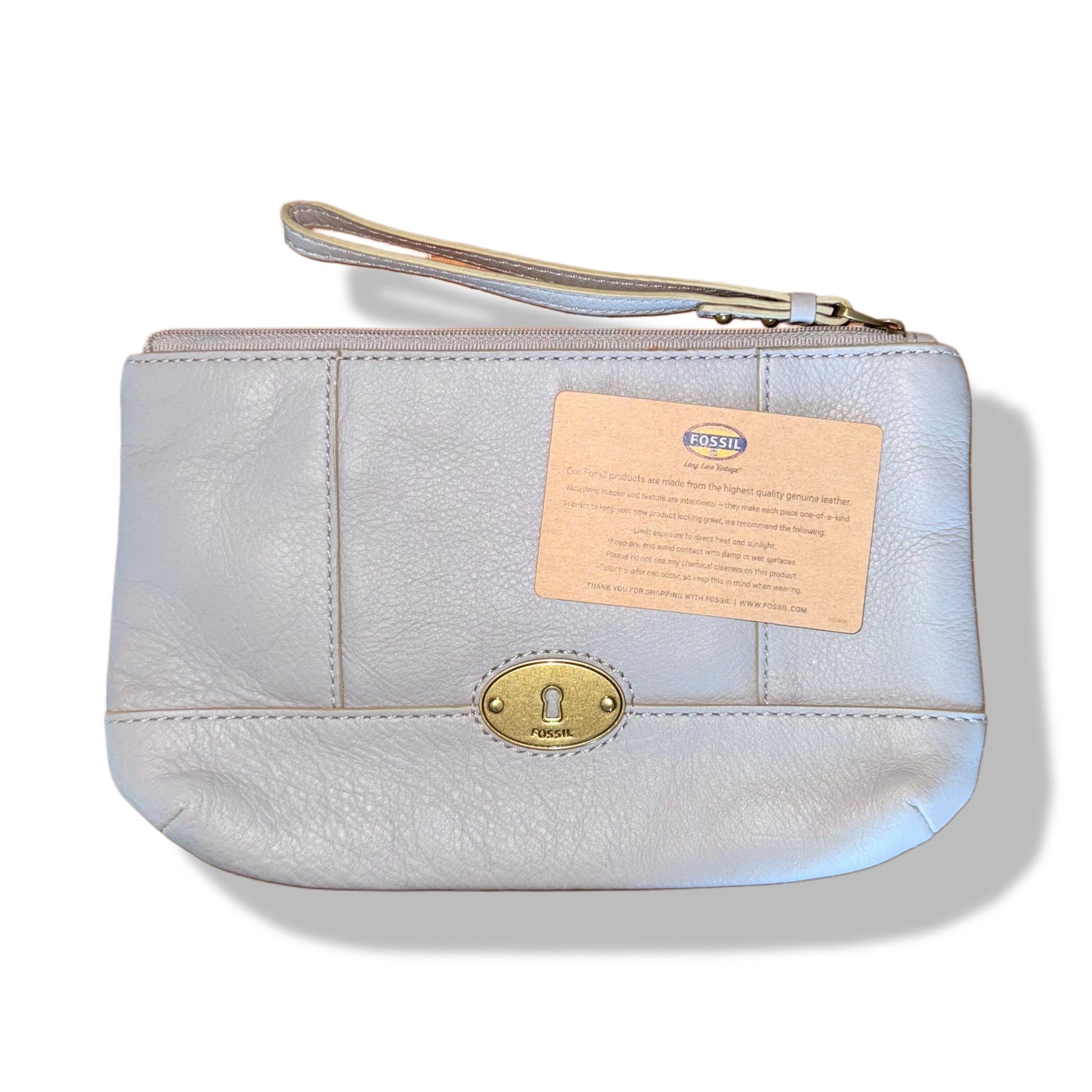 Wristlet Fossil en piel color gris claro, diseño minimalista y funcional. Silueta rectangular con cierre superior y strap de muñeca, ideal para llevar lo esencial. Detalle frontal metálico con logo Fossil y compartimentos interiores para mejor organización. Perfecto para uso diario o como bolso pequeño de mano.