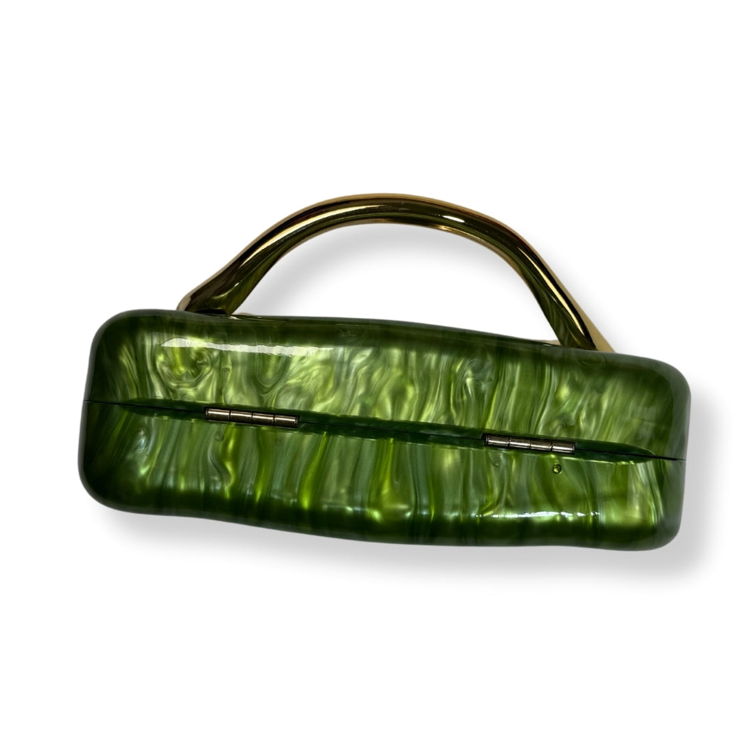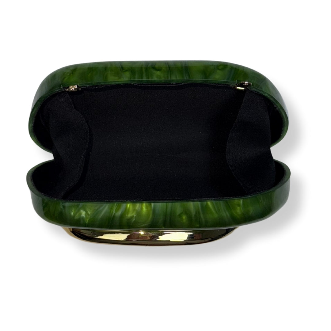 Clutch de acrílico verde con patrón mármol que destaca por su construcción rígida y arquitectura contemporánea. El asa dorada actúa como elemento focal, mientras que la cadena desmontable permite transitar entre uso de mano y el hombro. Cierre magnético de precisión. Diseño rígido, moderno y llamativo, ideal para elevar cualquier look de noche.
