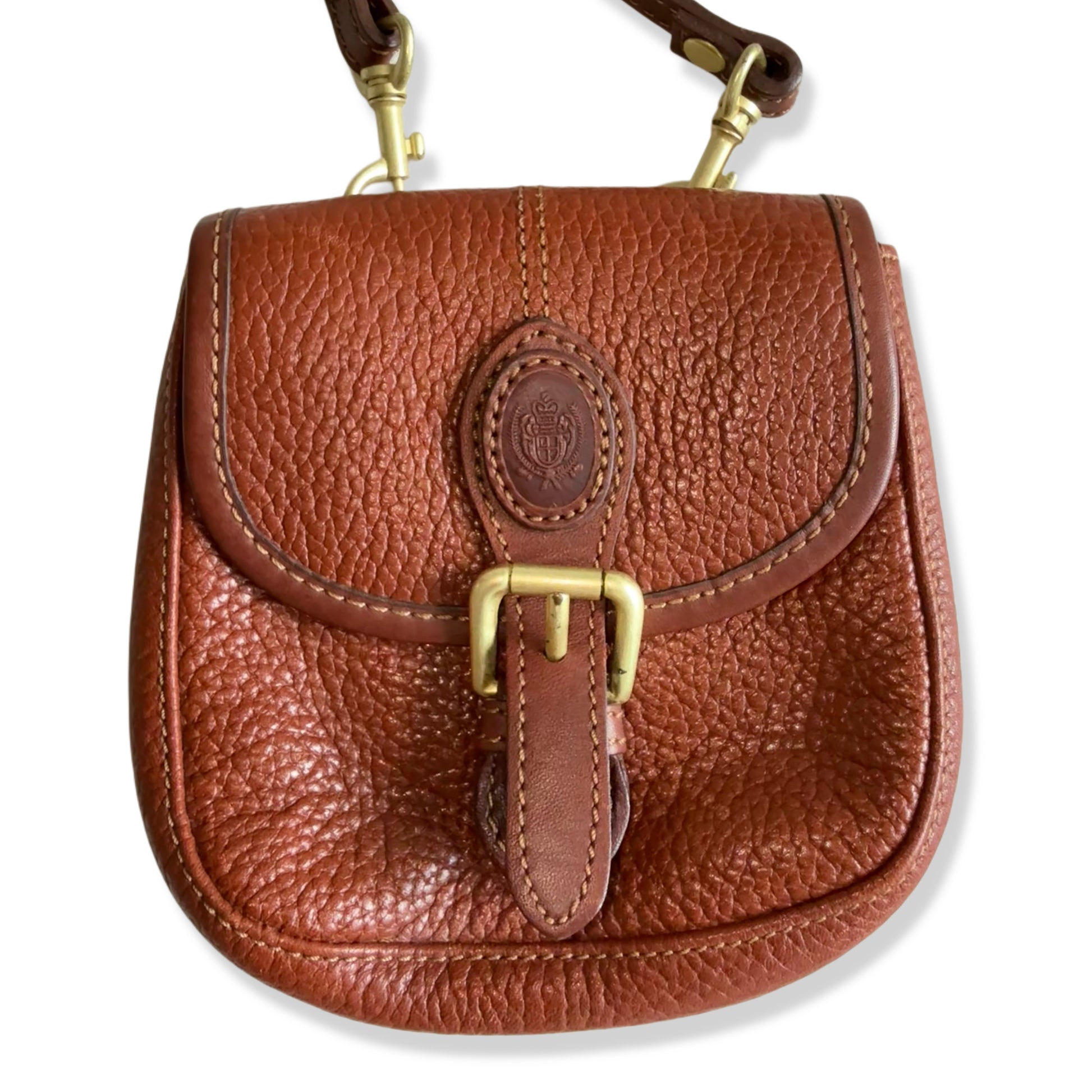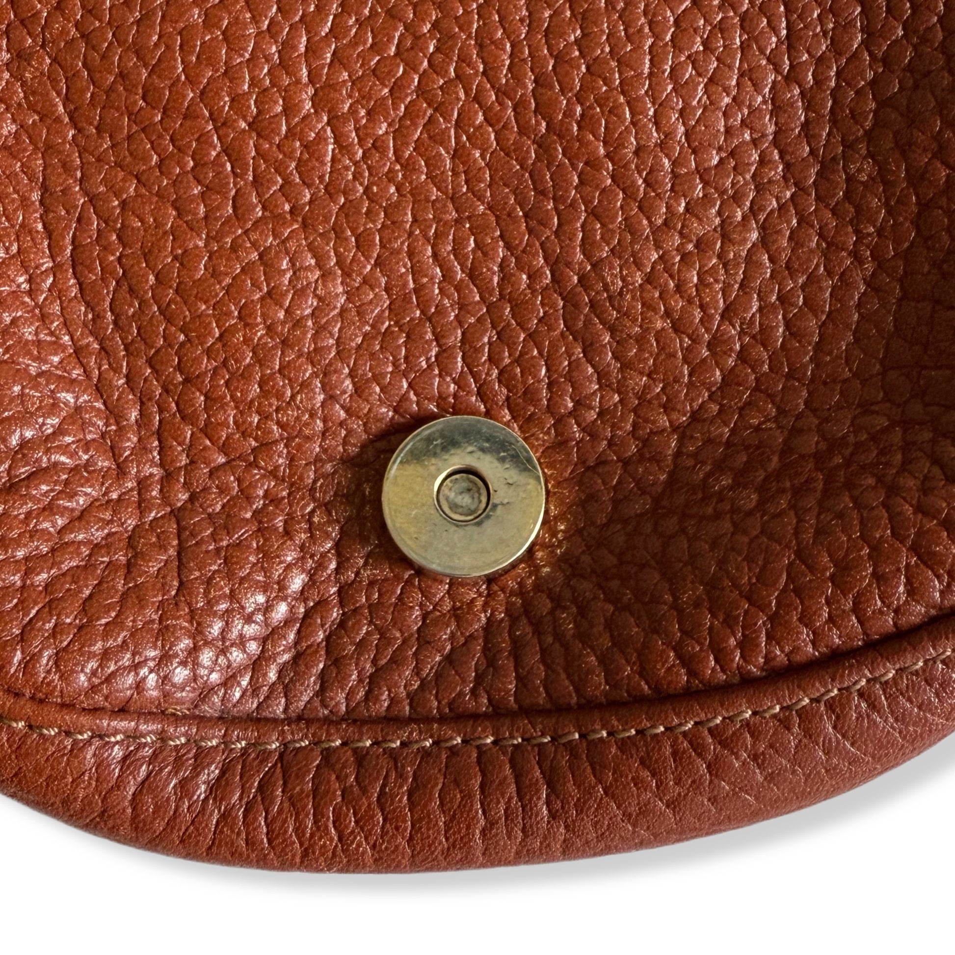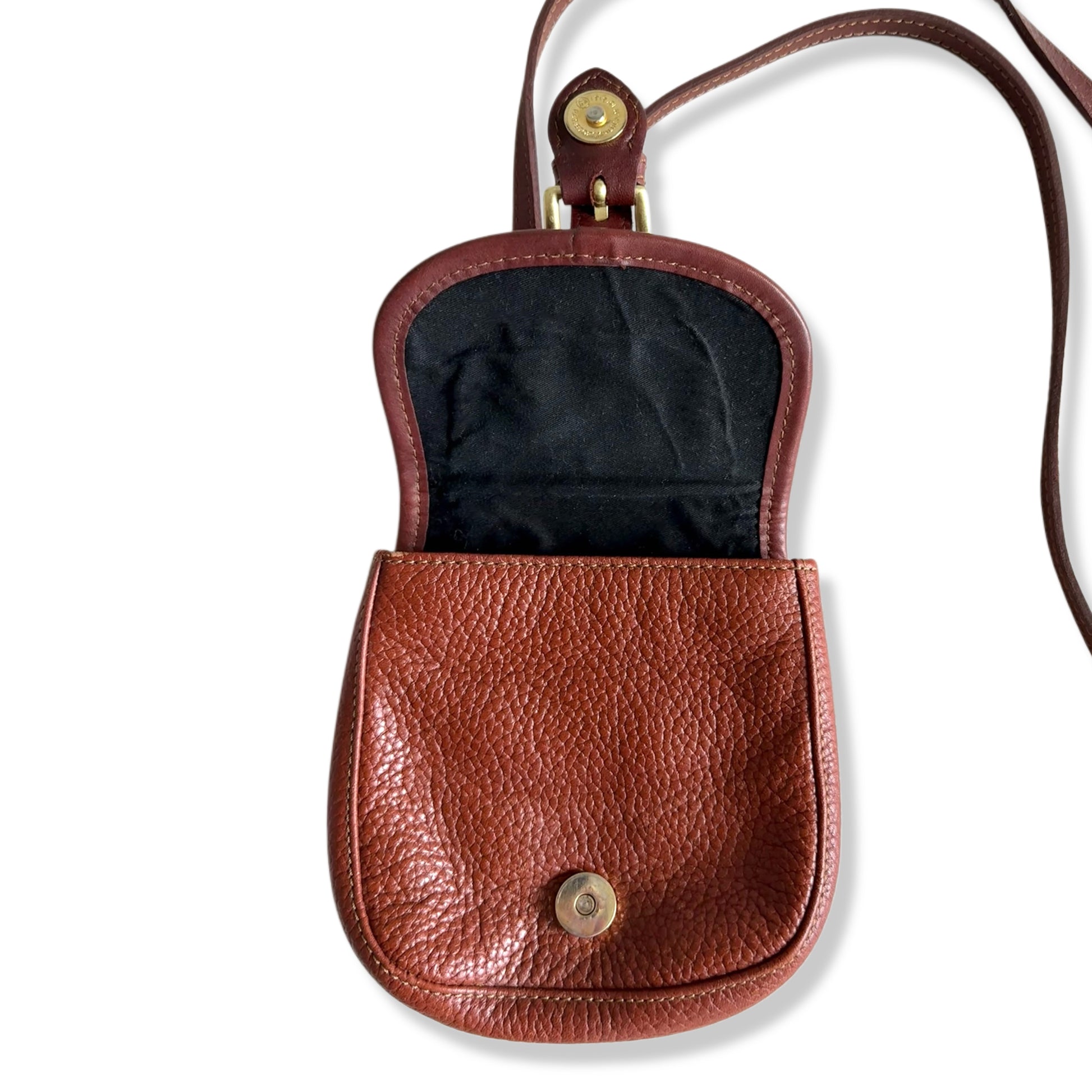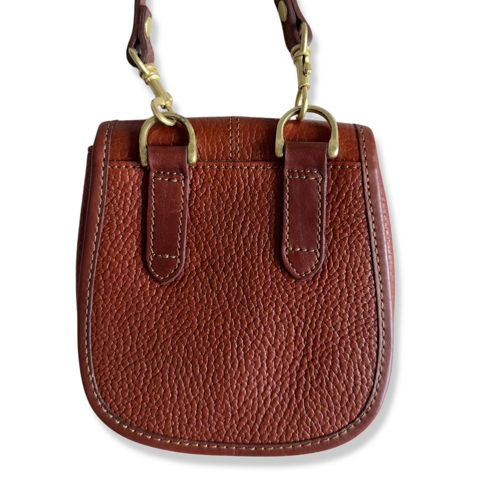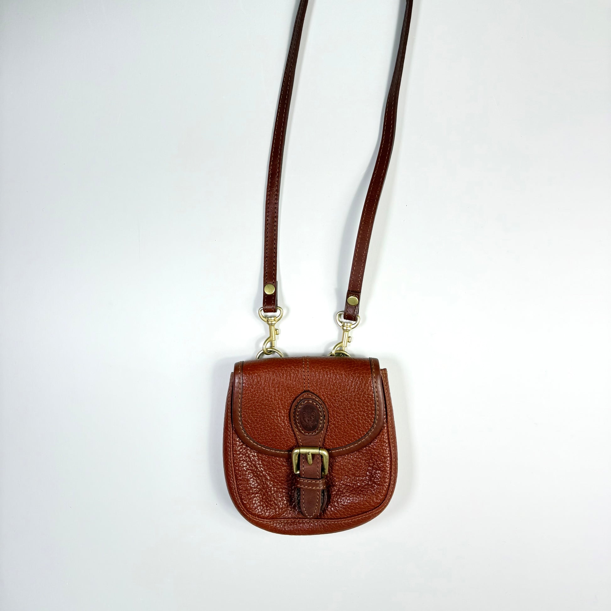 Cartera crossbody de cuero genuino en tono marrón coñac, textura granulada, herrajes metálicos y cierre frontal con hebilla decorativa. Asa larga desmontable. Interior forrado en negro, tamaño compacto ideal para esenciales.