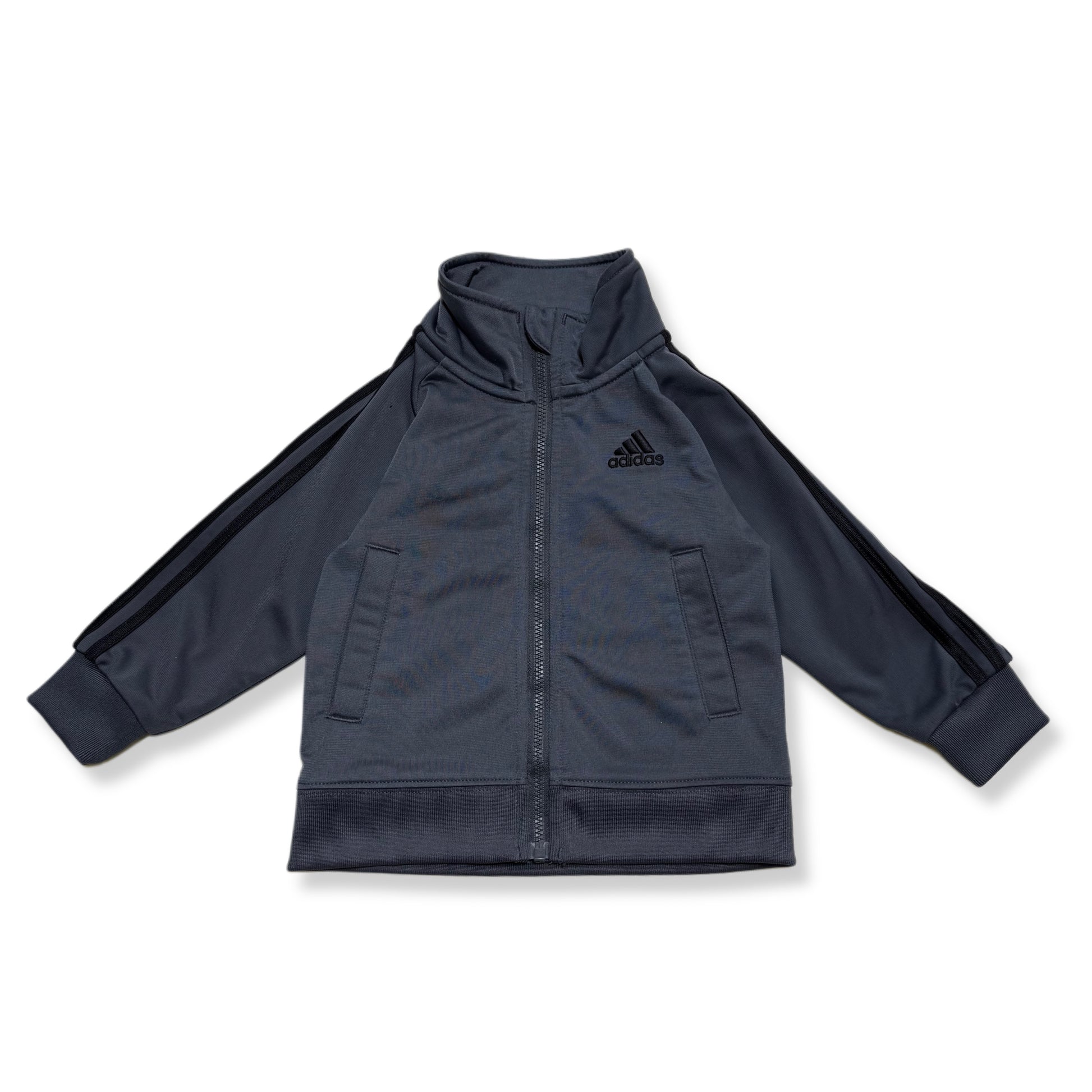 Chaqueta deportiva color gris oscuro con cierre frontal, cuello alto y manga larga. Diseño clásico Adidas con líneas en contraste en las mangas y bolsillos laterales. Cómoda y práctica para uso diario.