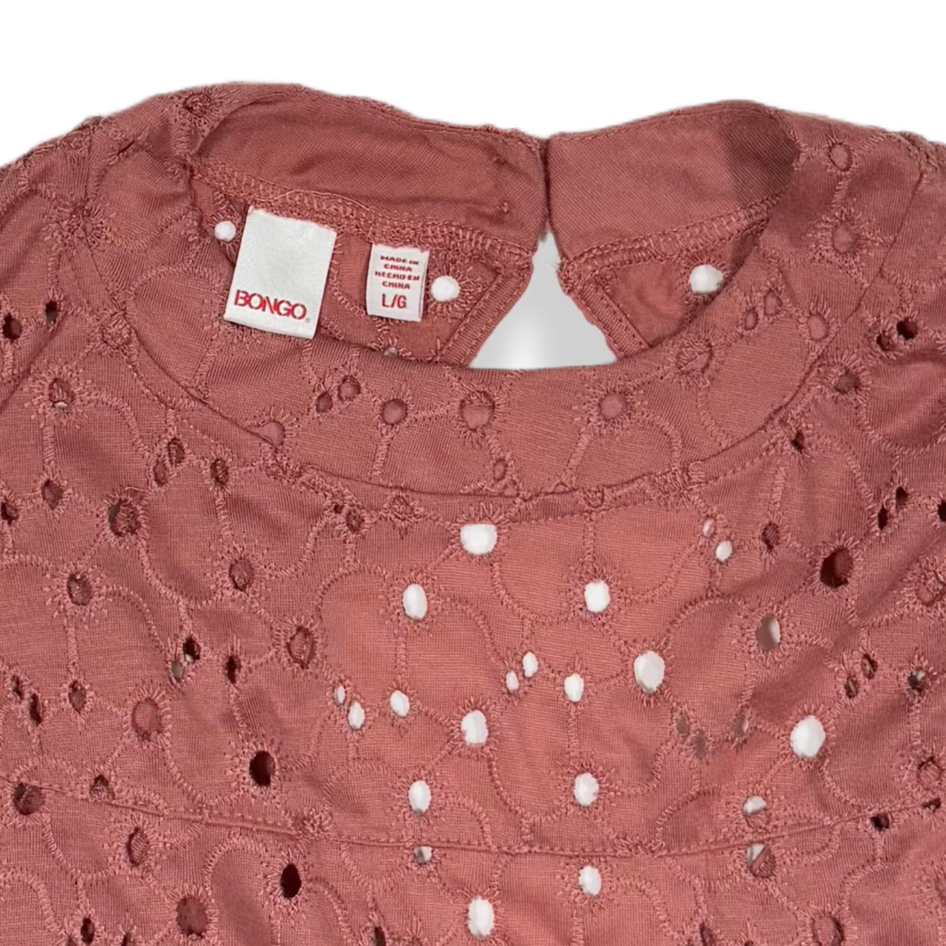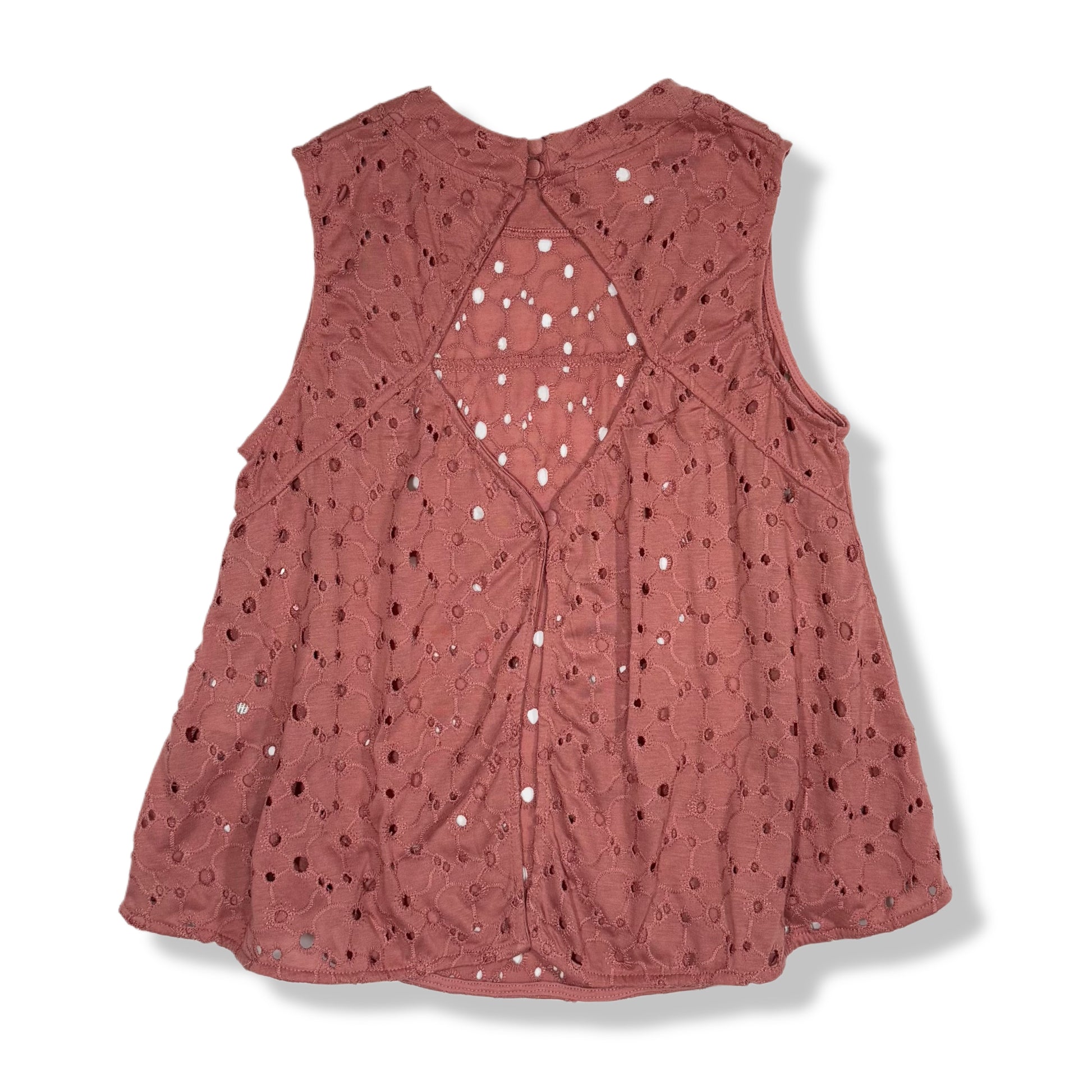 Blusa sin mangas en tono rosa viejo, con diseño calado tipo bordado y silueta amplia. Tela ligera, fresca y con caída suave, ideal para climas cálidos. Tiene detalle de abertura en la espalda con botón en el cuello que aporta un toque delicado y diferente. Fácil de combinar con pantalones, faldas o jeans.