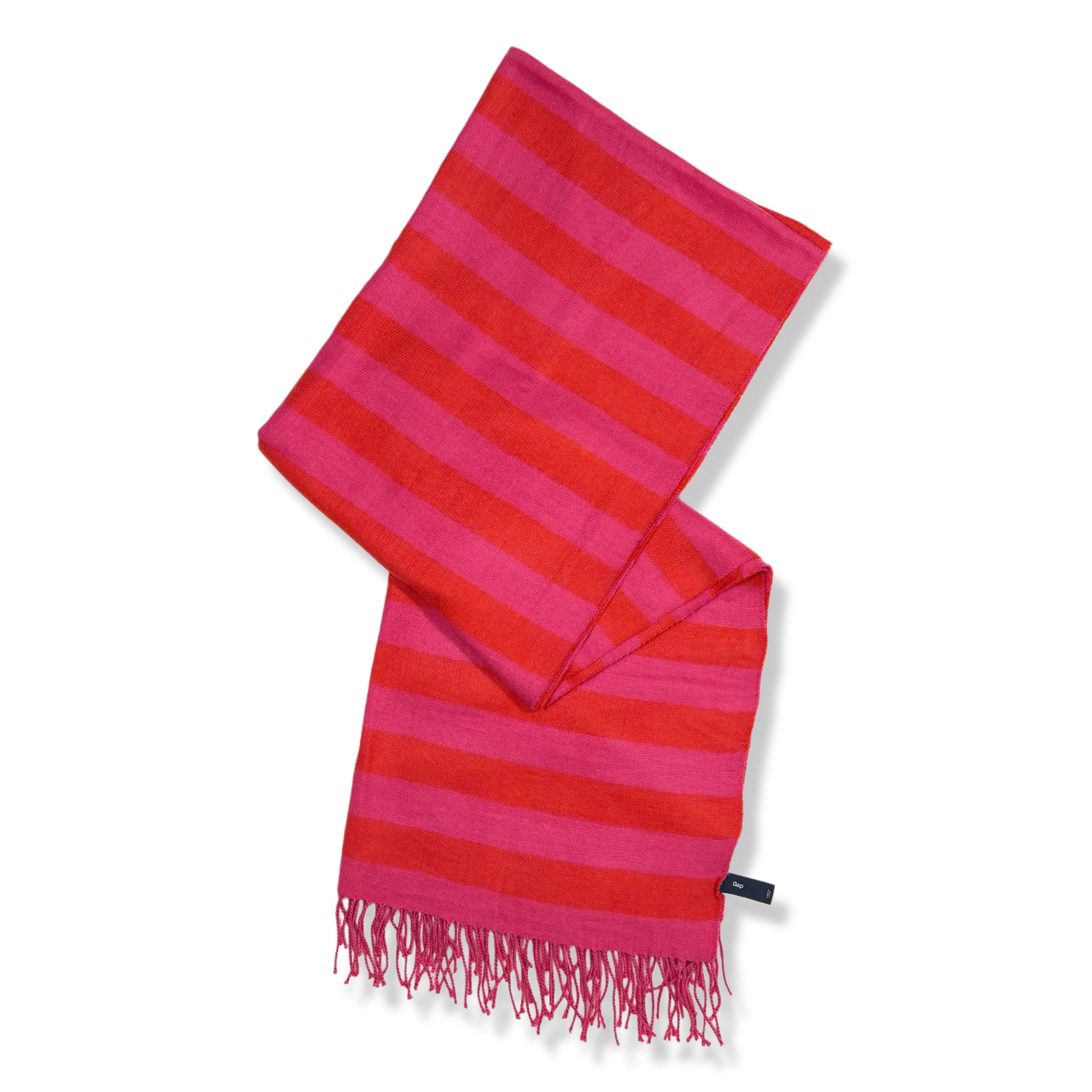 Bufanda tejida de diseño a rayas en tonos fucsia y anaranjado. Textura suave, ligera y cálida, con flecos en los extremos que aportan movimiento. Ideal para darle un toque de color a looks neutros o de invierno.