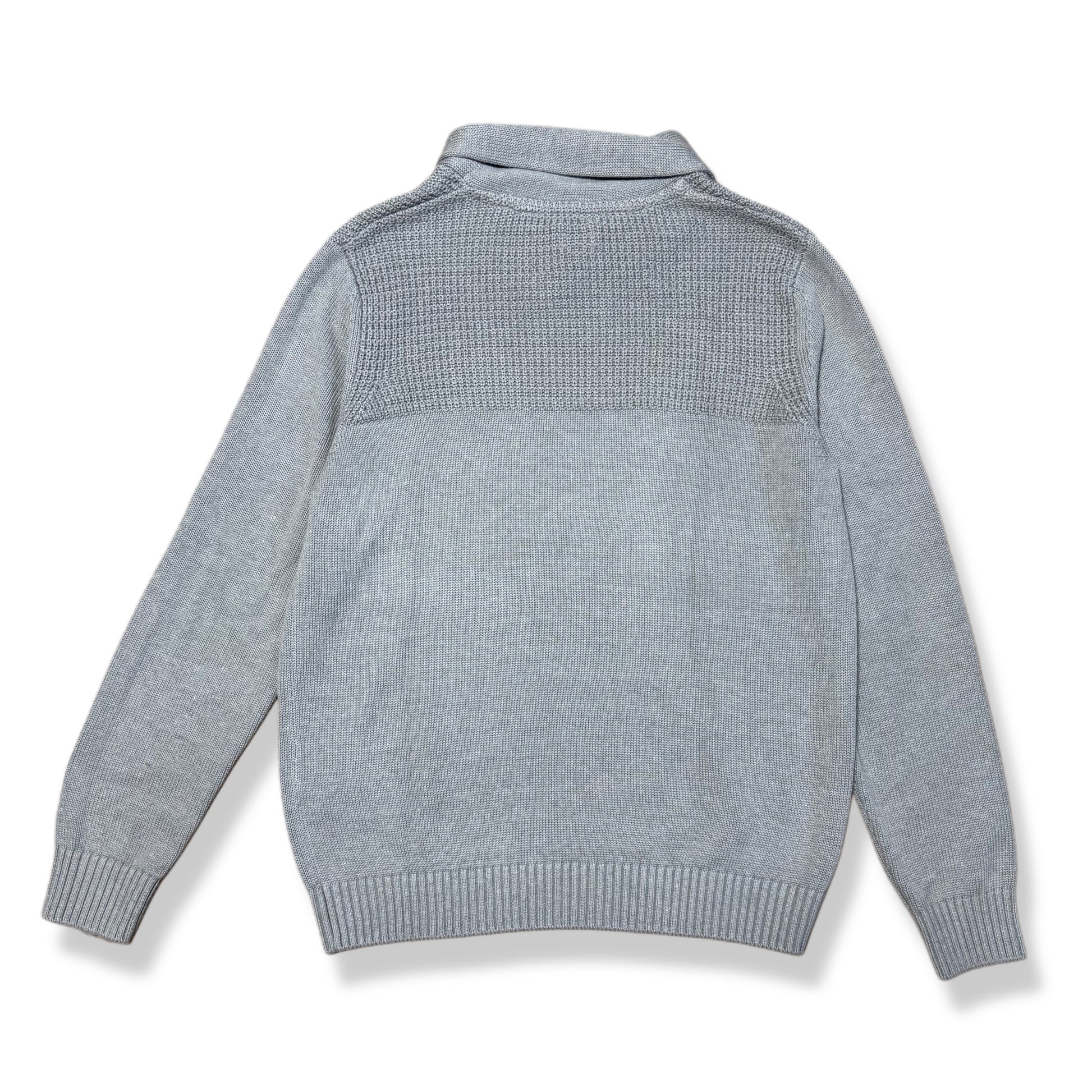 Suéter tejido color gris claro, de manga larga y corte clásico. Diseño con cuello alto suave y tejido combinado en el pecho que le da textura sin cargar el look. Cómodo y versátil, ideal para uso diario, trabajo o salidas casuales.