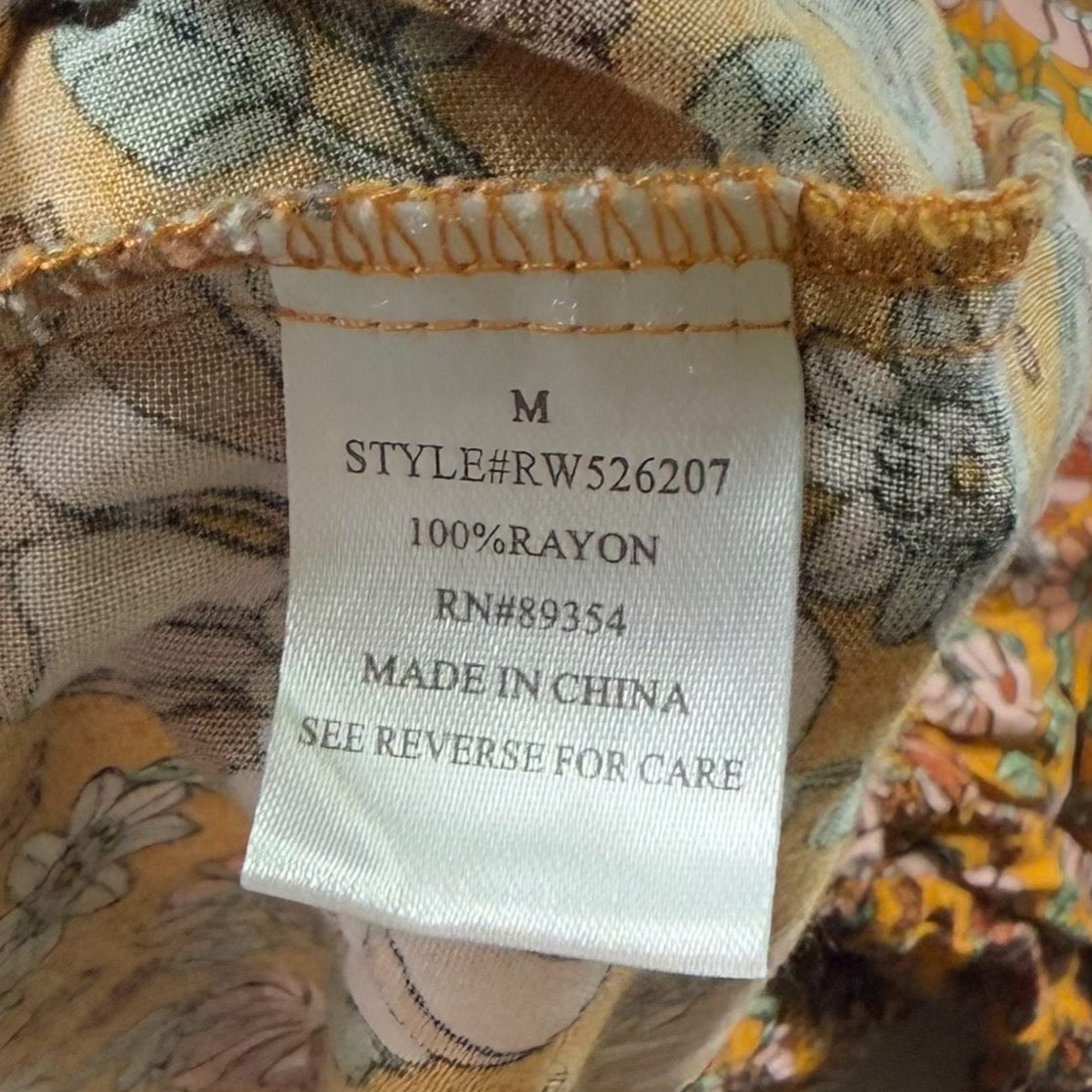 Vestido con estampado floral en tonos mostaza, rosado y lila, manga larga abullonada, cuello en V y cintura elástica. Diseño fluido y ligero para uso casual o salidas diurnas.