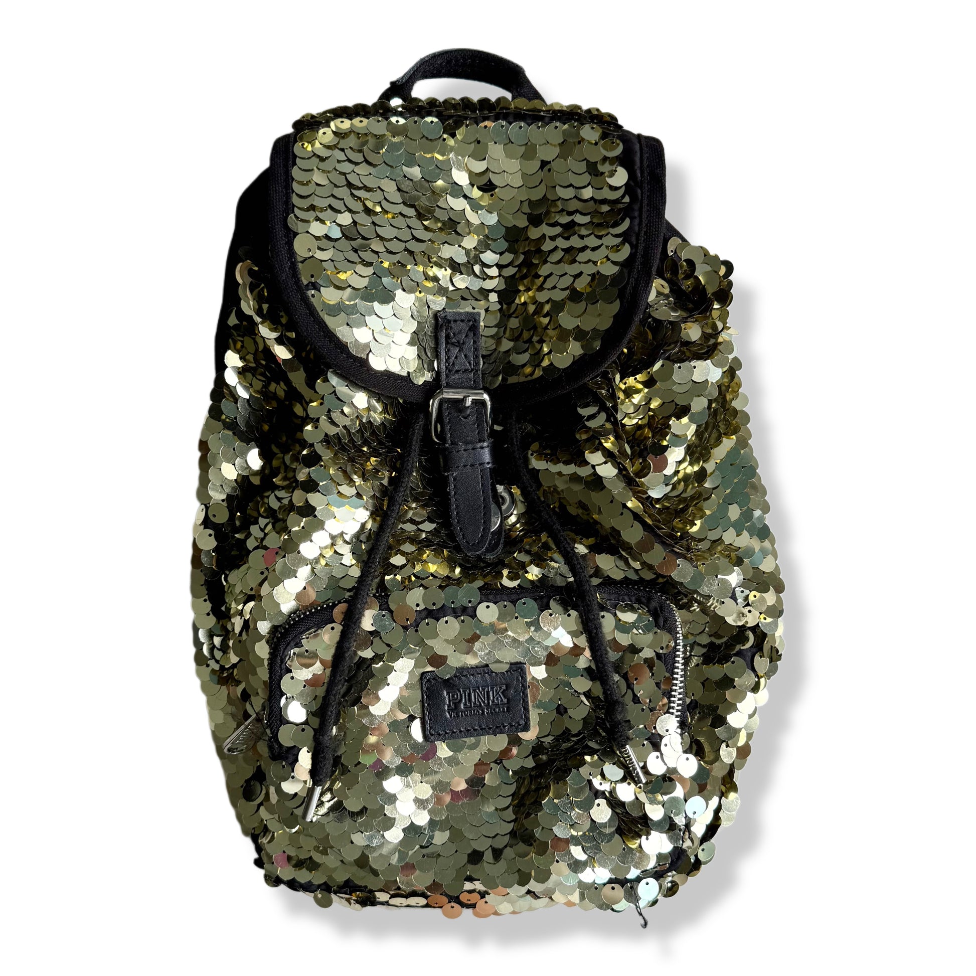 Una mochila que brilla tanto como tú. Esta pieza de PINK combina funcionalidad y estilo con lentejuelas doradas que capturan la luz en cada movimiento. Ideal para destacar en salidas casuales, festivales o cuando simplemente quieres un toque de glamour en tu look diario.