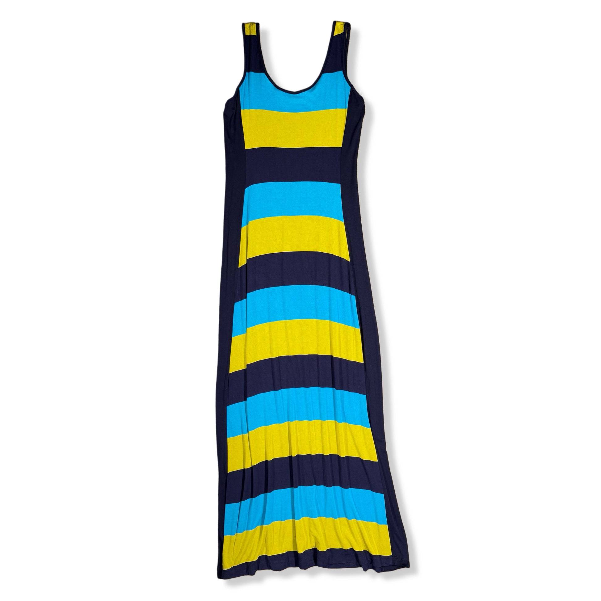 Vestido largo de rayas horizontales en azul marino, azul turquesa y amarillo. Diseño sin mangas con escote redondo y silueta fluida que cae recta hasta el tobillo. Tela suave y elástica que se adapta al cuerpo sin marcar.