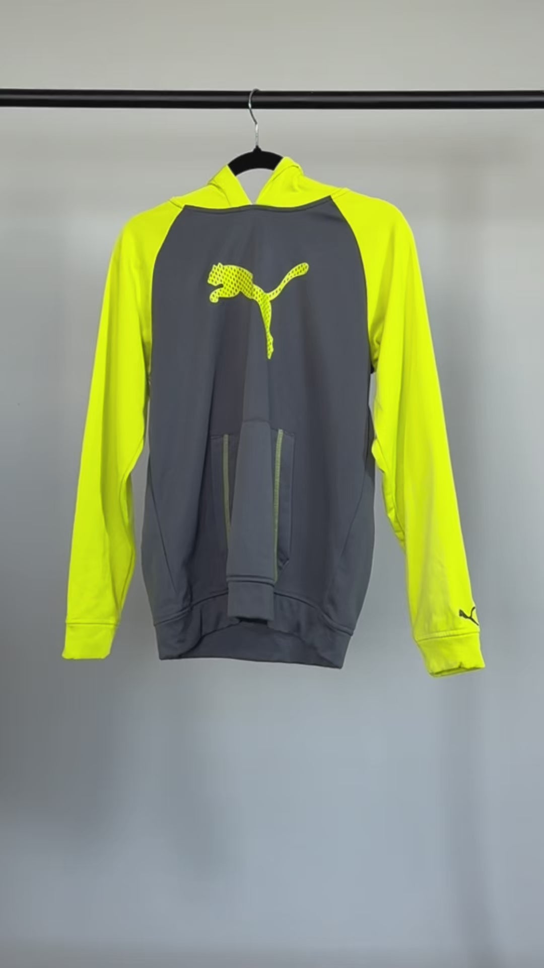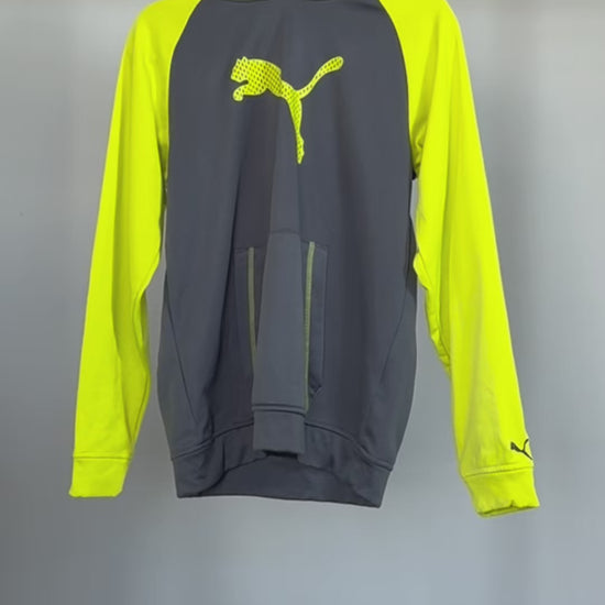 Sudadera deportiva Puma en talla L, confeccionada en 100% poliéster. Combina gris con detalles en amarillo neón, ideal para niños activos. Cuenta con capucha, bolsillo canguro frontal y logos Puma en pecho y manga. Diseño ligero y funcional para uso diario o actividades deportivas.