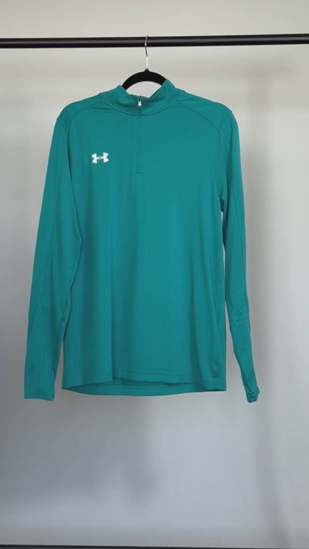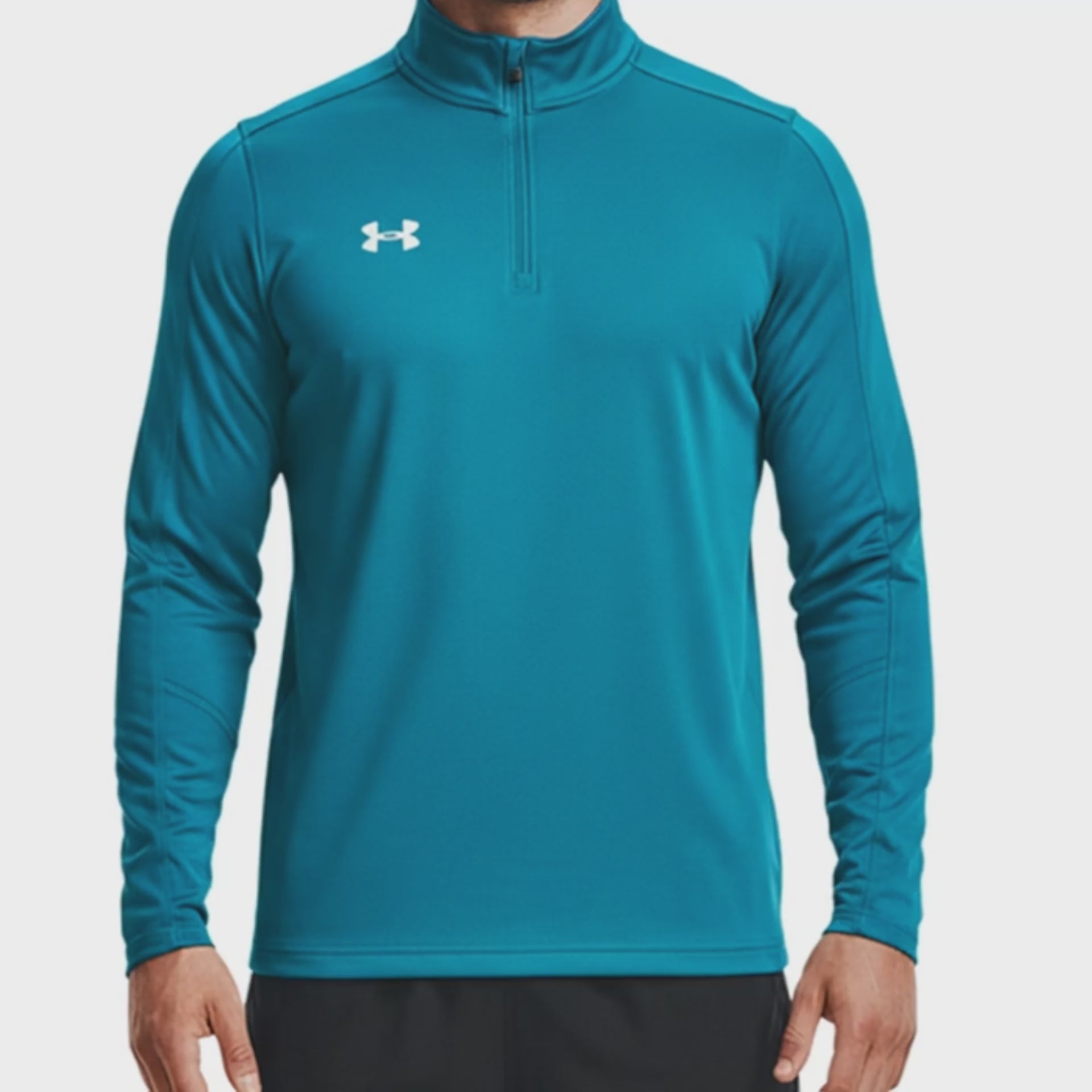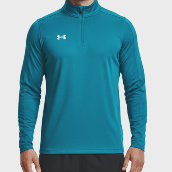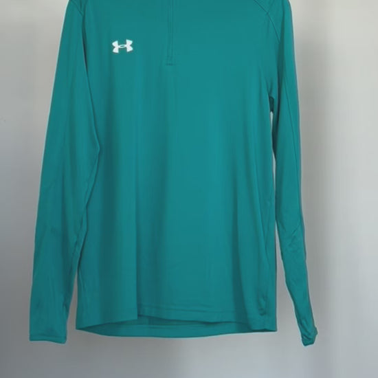 Suéter deportivo Under Armour en turquesa con cierre 1/4 zip y logo blanco en el pecho. Confeccionado en poliéster técnico ligero, ofrece comodidad y funcionalidad para entrenamientos, caminatas y uso casual. Diseño ergonómico con costuras estratégicas que permiten libertad de movimiento.