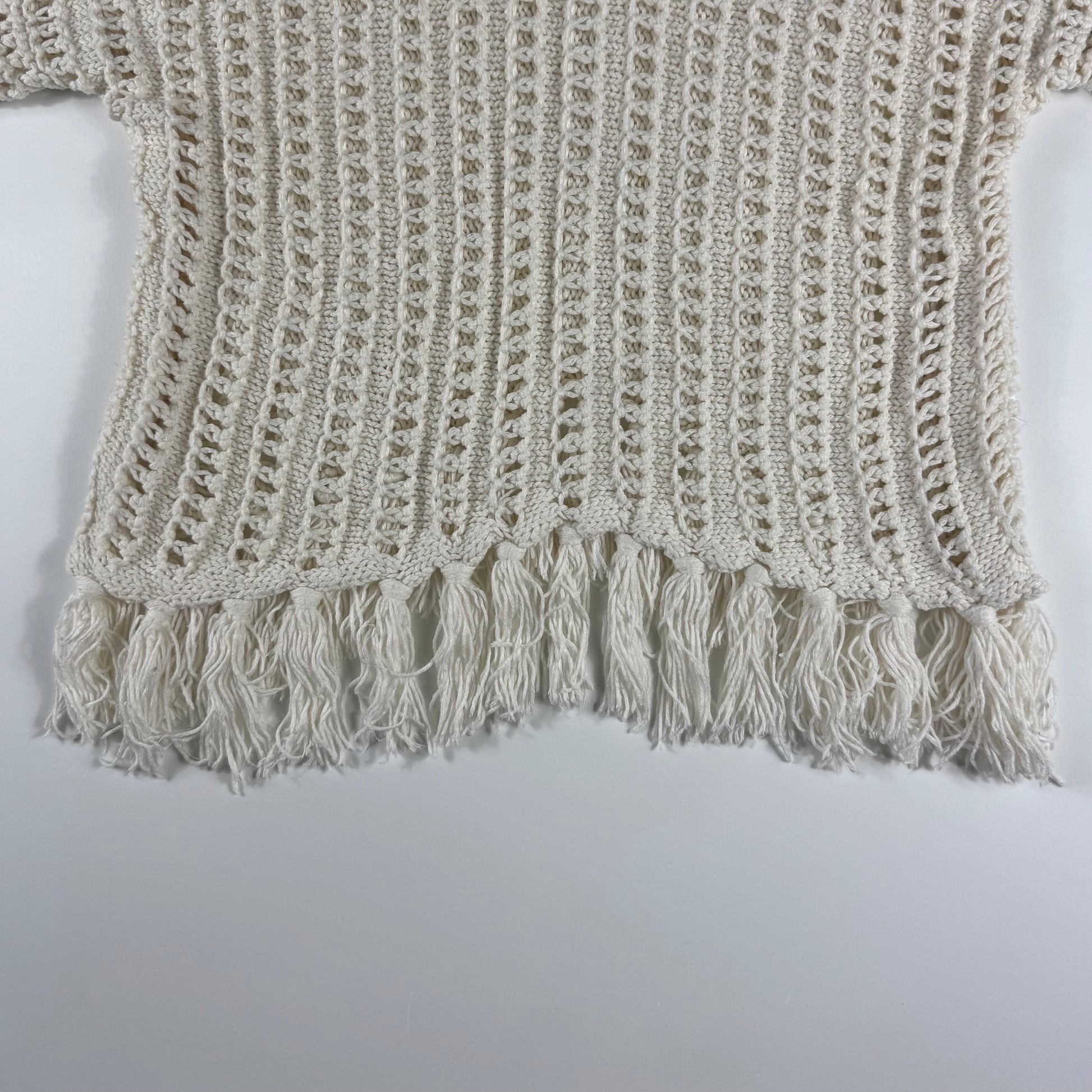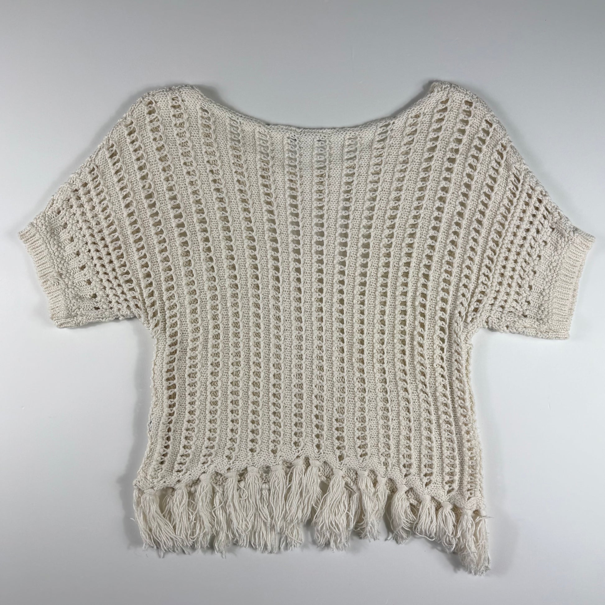 Top tejido calado en tono crema, diseño de punto abierto con textura vertical. Mangas cortas amplias, cuello redondo y detalle de flecos en el ruedo que aporta movimiento y un aire boho. Silueta relajada, ideal para layering o looks de clima cálido.