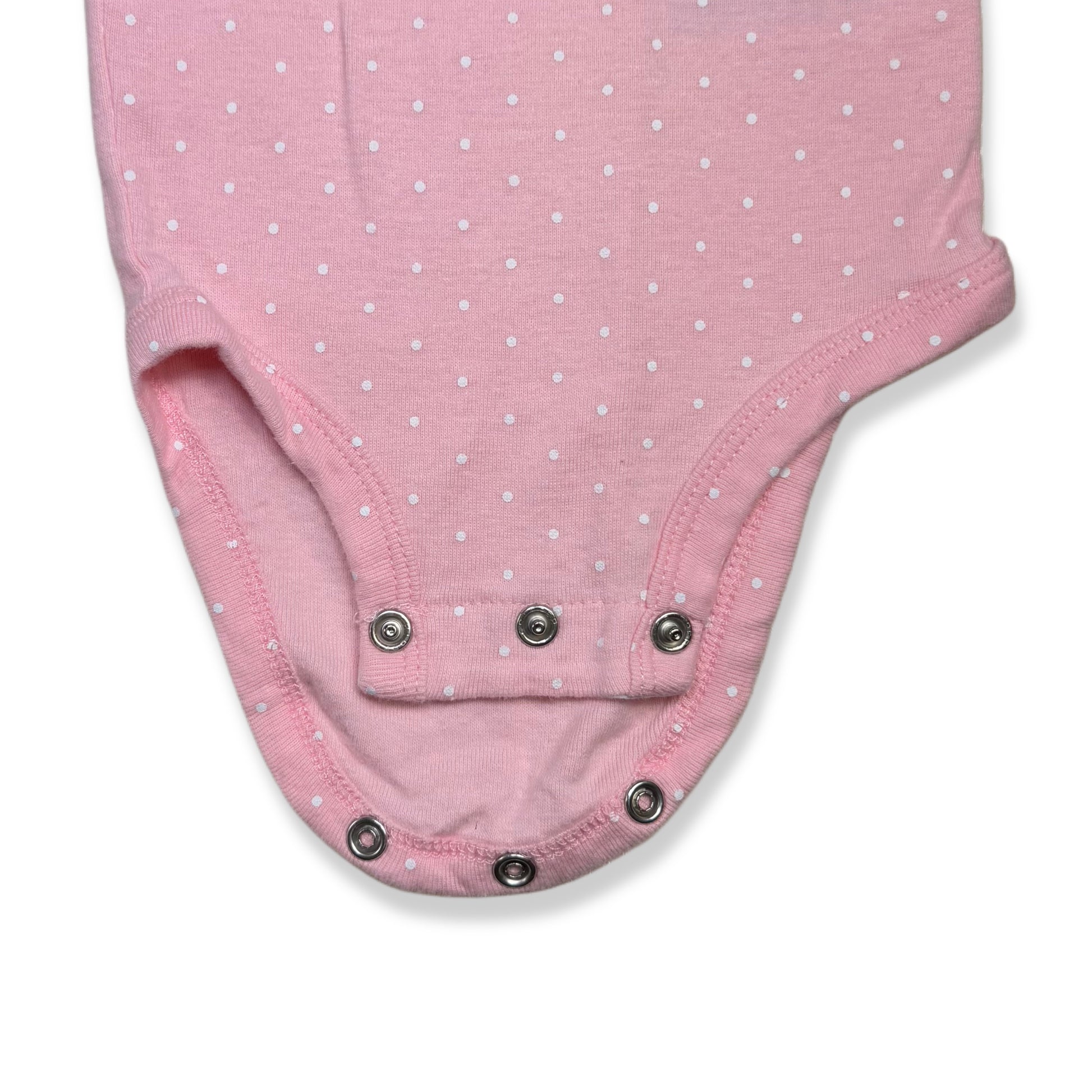 Enterizo de manga corta para bebé en color rosa suave con textura acanalada y estampado de lunares blancos pequeños. Cuello redondo con lazo blanco decorativo en el frente, diseño adorable de dos perritos con moños y la frase "SO CUTE" debajo. Cierre de broches en la entrepierna para cambio fácil. Estilo tierno y femenino, ideal para looks diarios o fotos lindas. Tela 100% algodón suave y transpirable, perfecta para el clima dominicano y piel sensible de bebé.