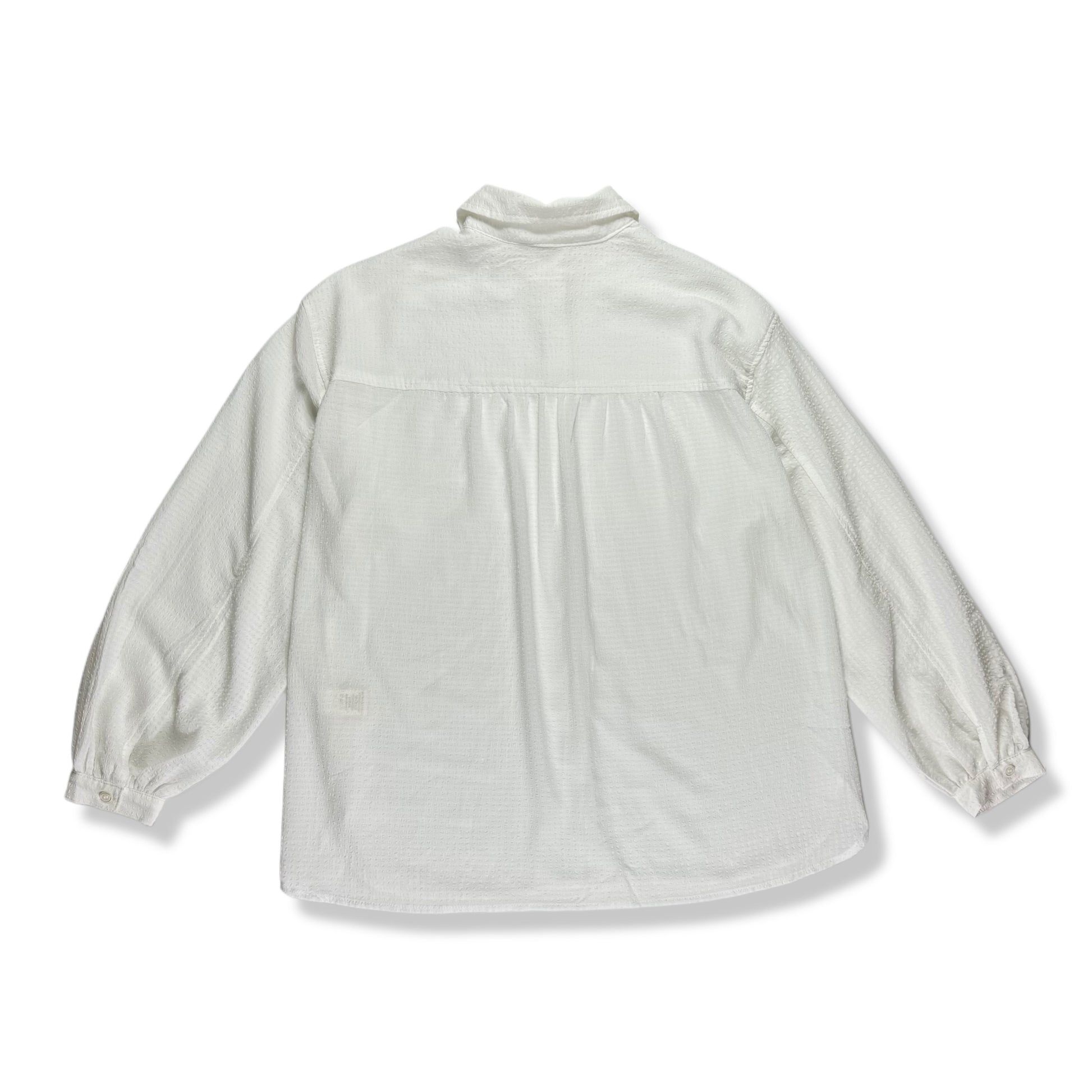 Camisa blanca lisa de manga larga abullonada con puños ajustados y cuello clásico. Diseño abotonado al frente, corte holgado y tela ligera para uso diario o casual.