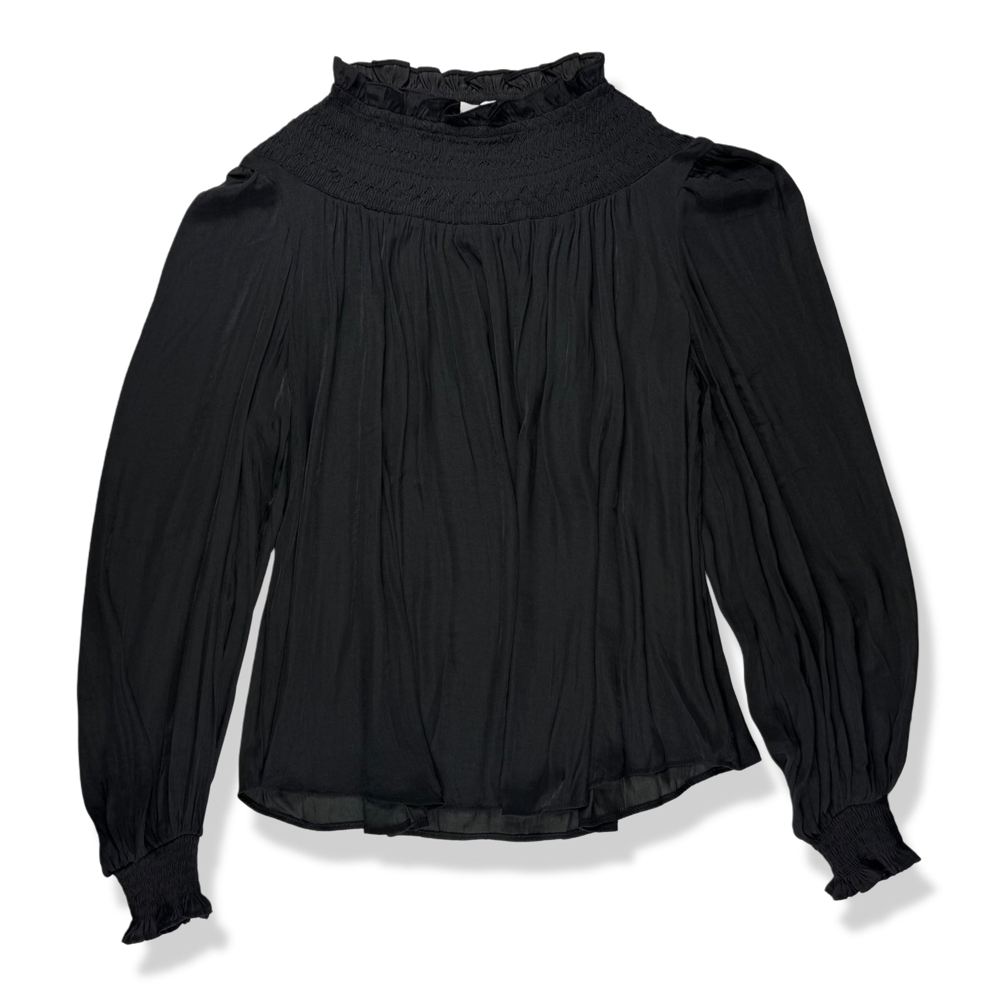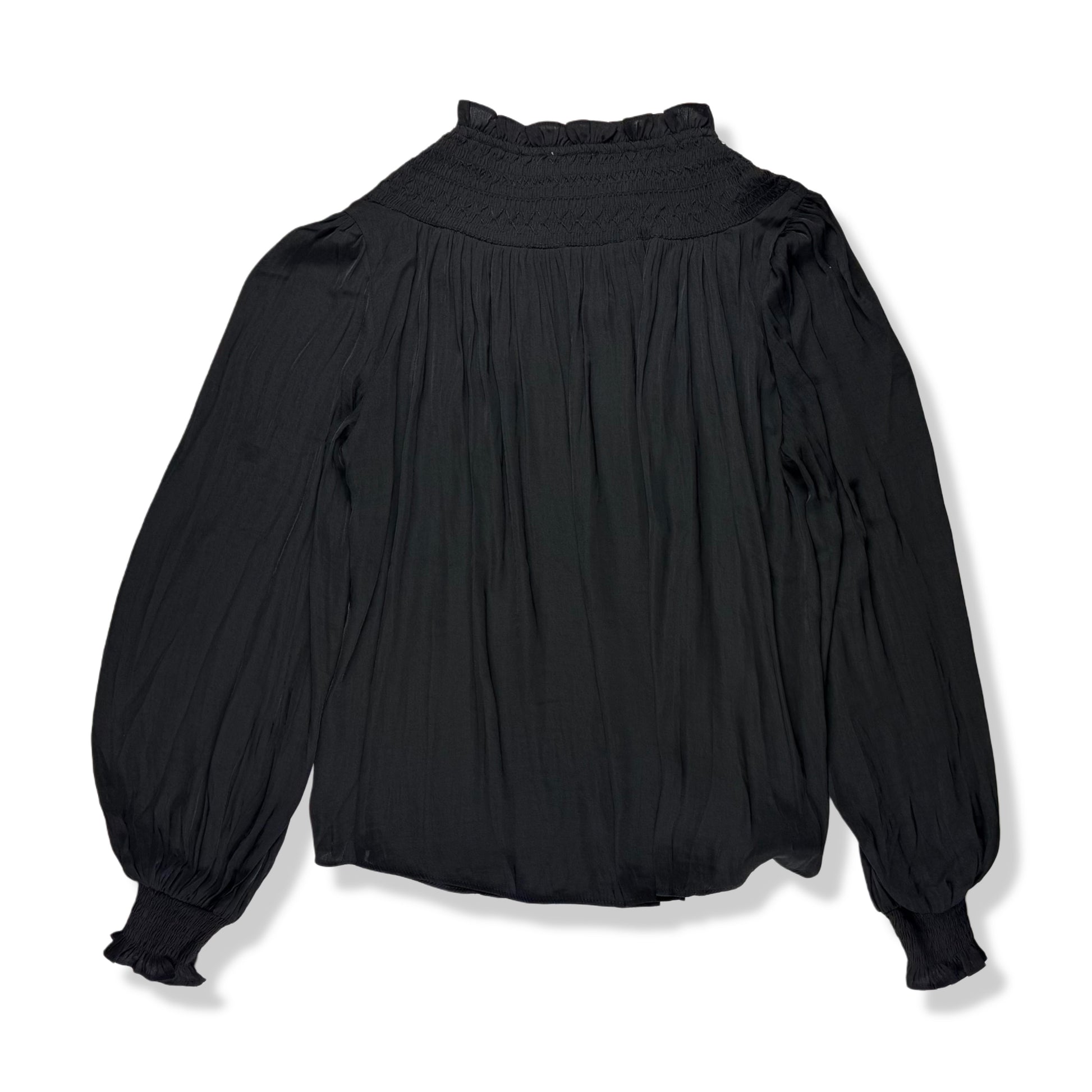 Blusa negra de manga larga con caída fluida y textura plisada. Diseño con cuello alto fruncido y puños elásticos que aportan un look elegante y versátil. Ideal para combinar con pantalones de vestir, faldas o denim para un outfit más relajado.