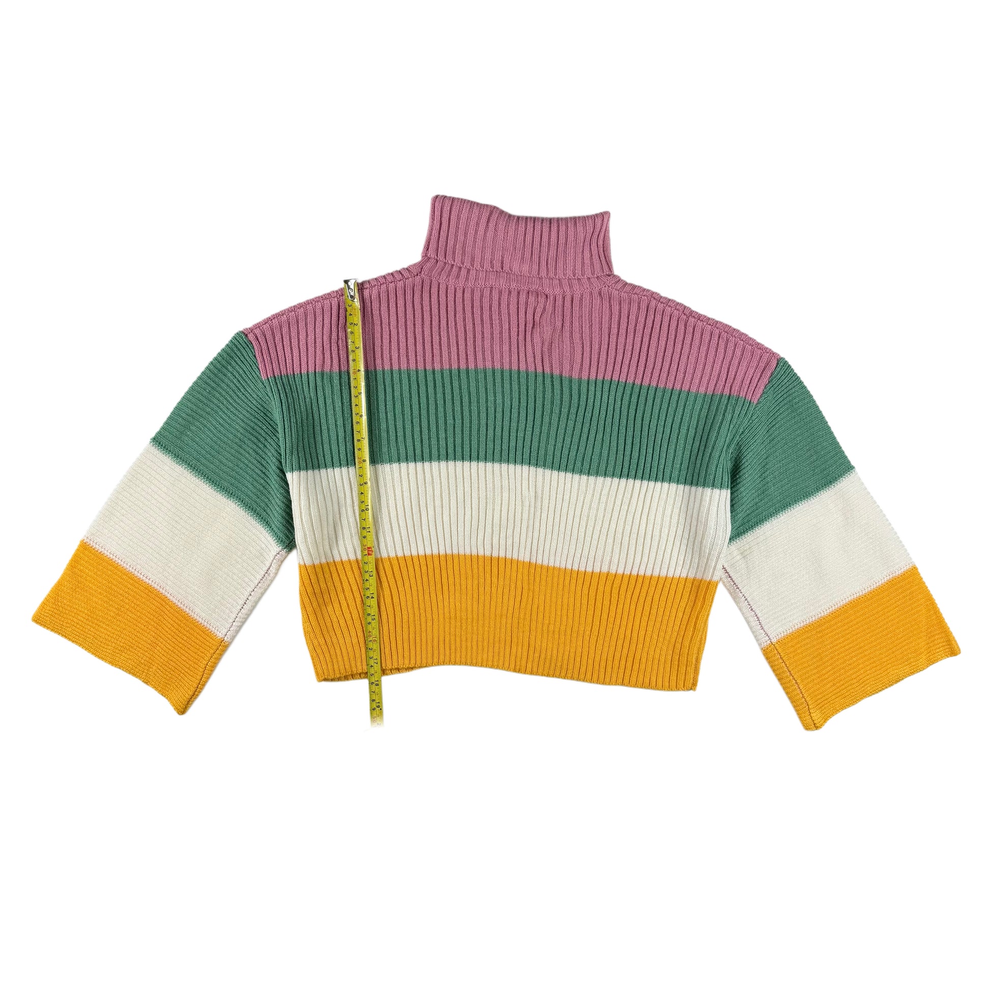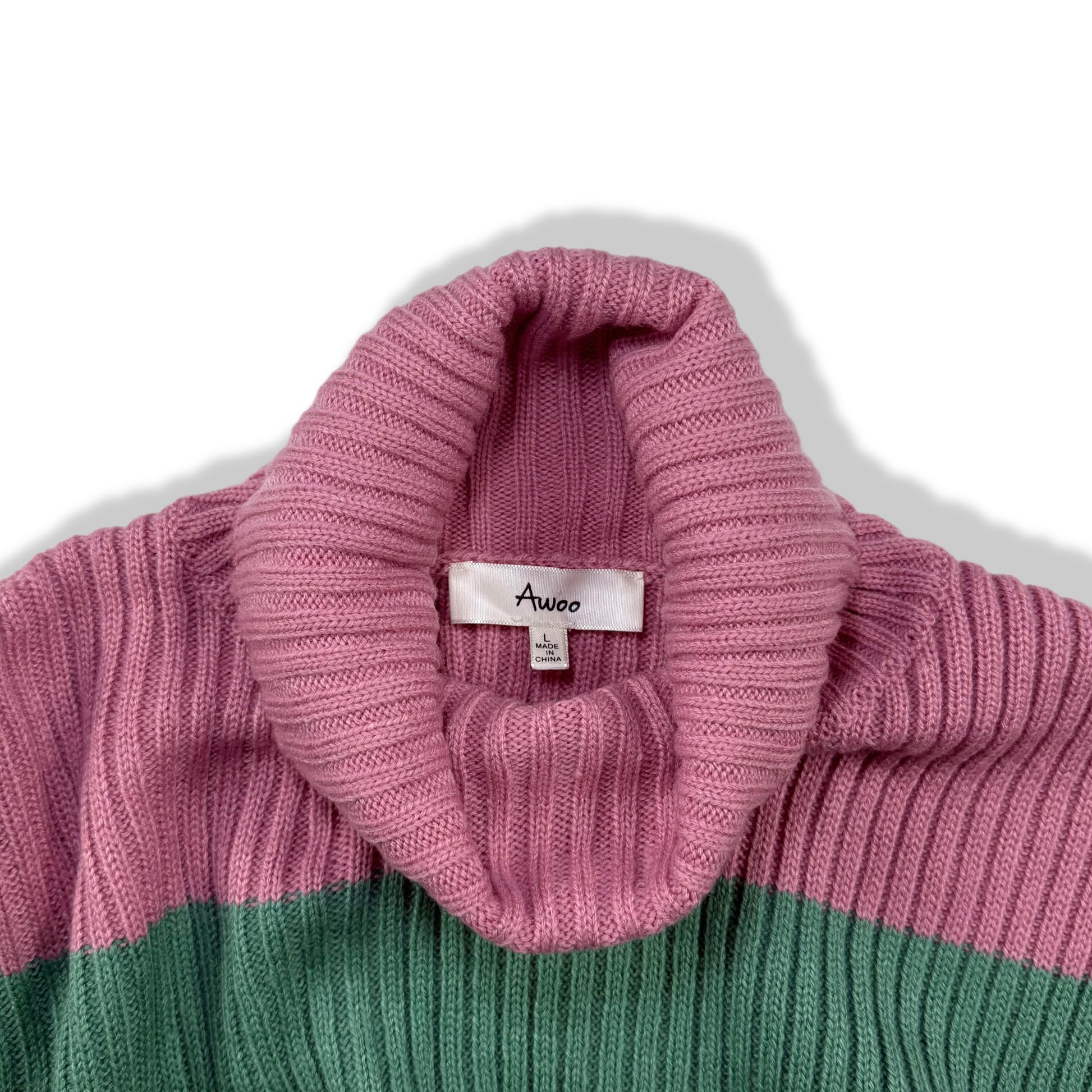 Suéter de punto grueso en bloques de colores. Cuello alto, caída recta y mangas anchas tipo kimono. Ideal para días fríos con un look moderno y divertido.