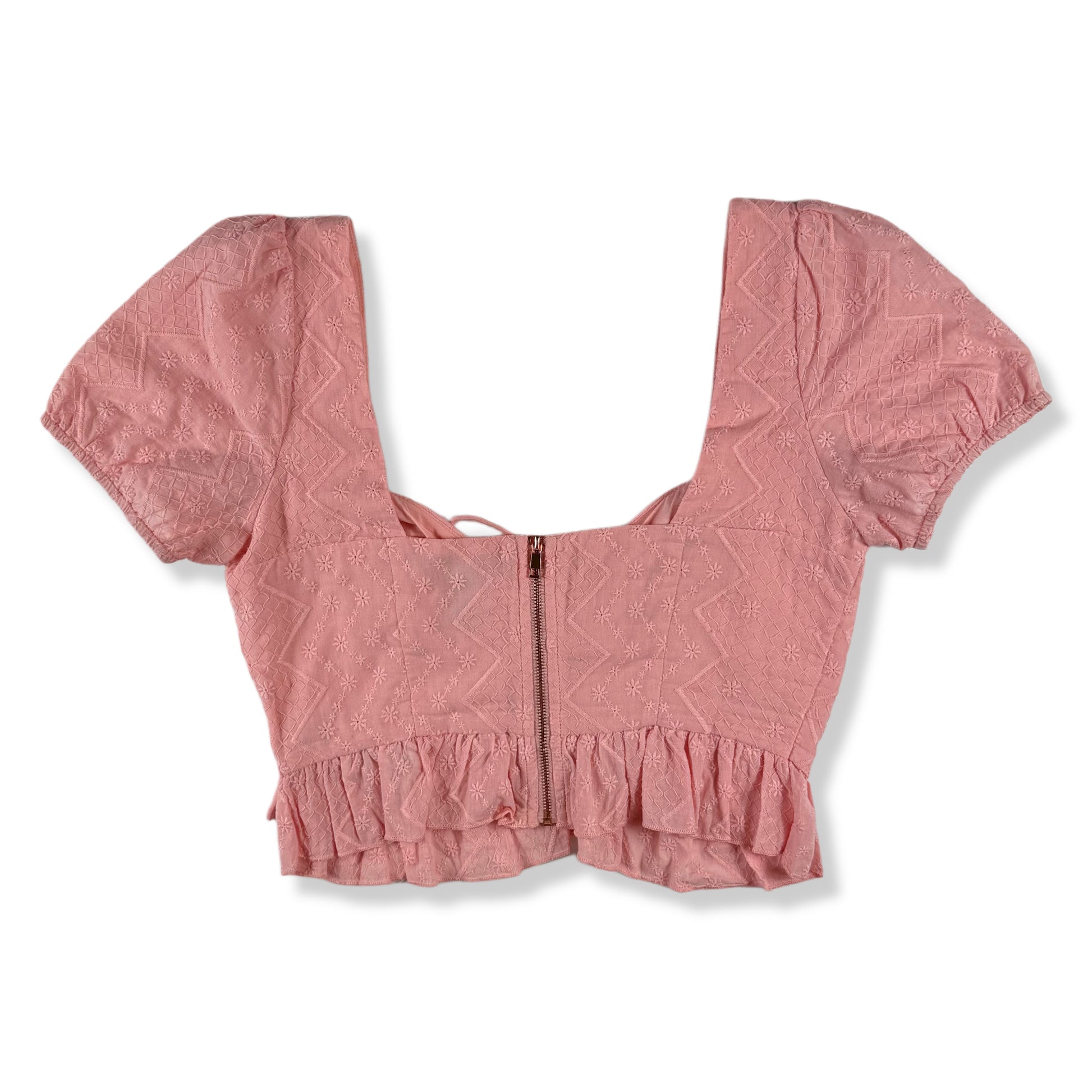 Blusa cropped color rosado con bordado en relieve. Diseño con mangas cortas abullonadas, escote en V con lazo ajustable al frente y cierre trasero. Corte corto con volante inferior que aporta estructura y un look femenino, ideal para outfits casuales o de salida.