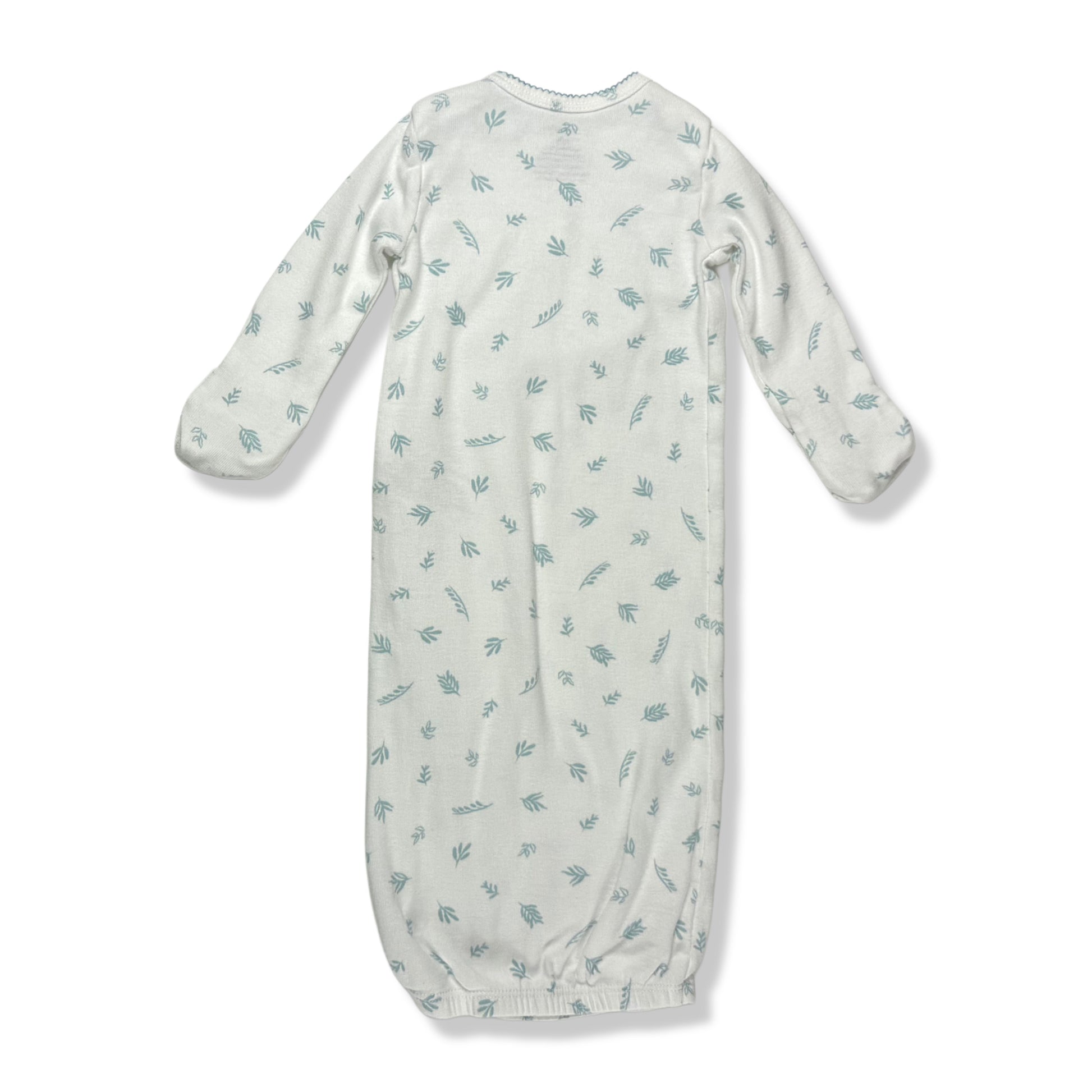 Saquito de dormir para recién nacido con delicado estampado de hojas en tono verde suave. Diseño cómodo y ligero, ideal para los primeros días del bebé. Tela suave y liviana, ideal para dormir y facilitar el cambio de pañal. Mangas largas y ajuste práctico en la parte inferior.