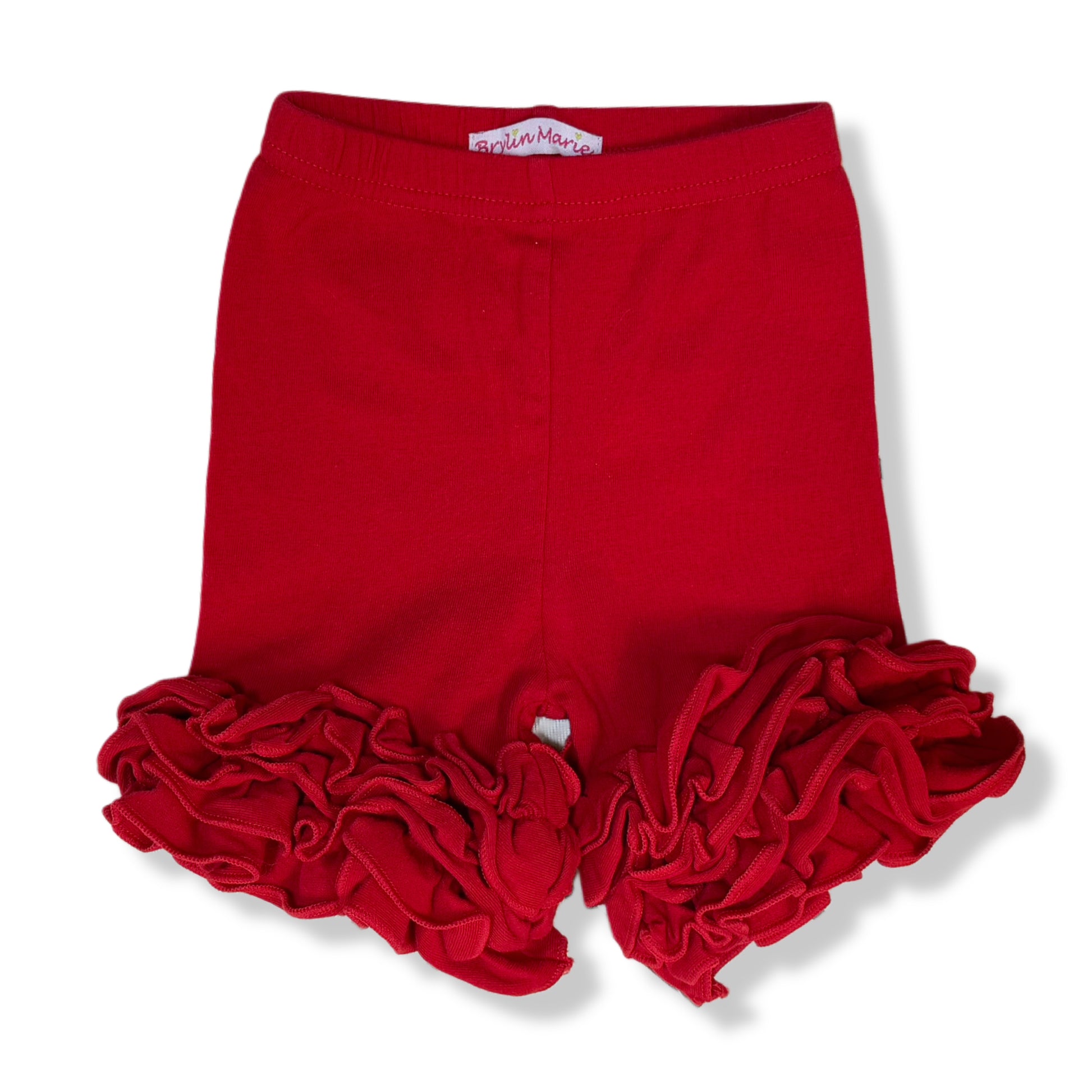 Shorts rojos para bebé con vuelos decorativos. Tela suave y elástica que brinda comodidad y libertad de movimiento.