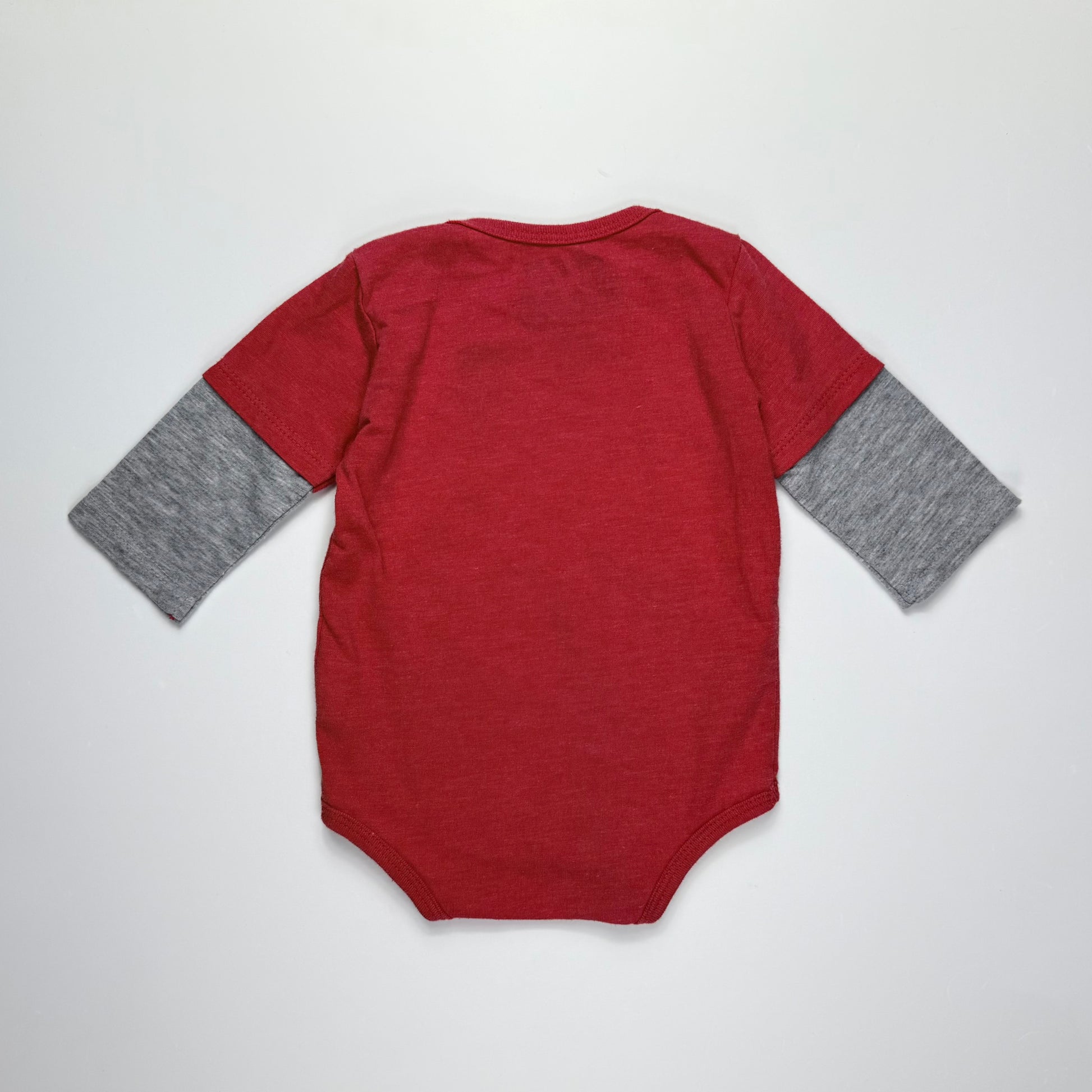 Body rojo de bebé con gráfico frontal de Star Wars en estilo retro multicolor, mangas largas con efecto layered en gris y cierre inferior con broches a presión. Suave, cómodo y práctico para el día a día.