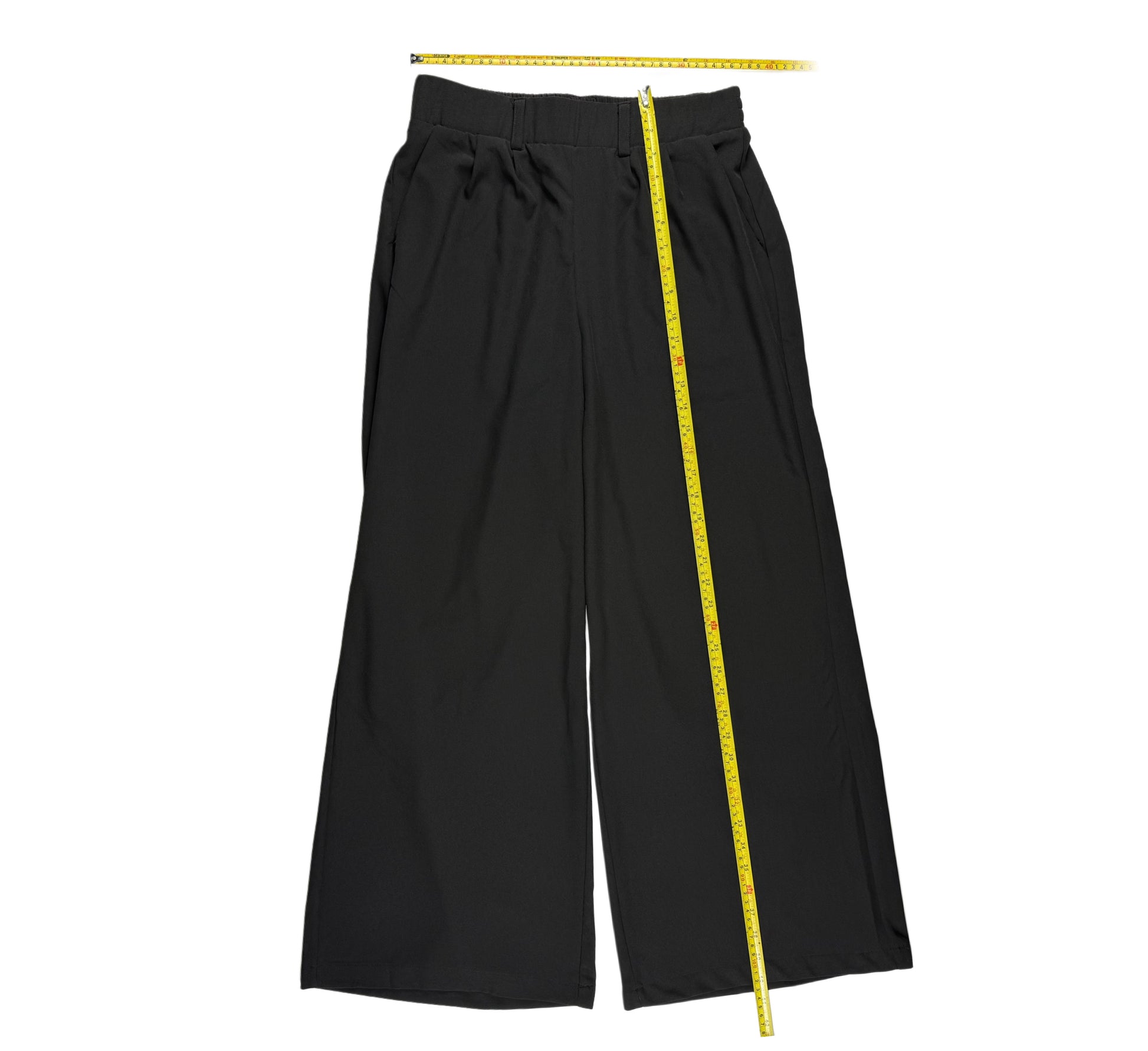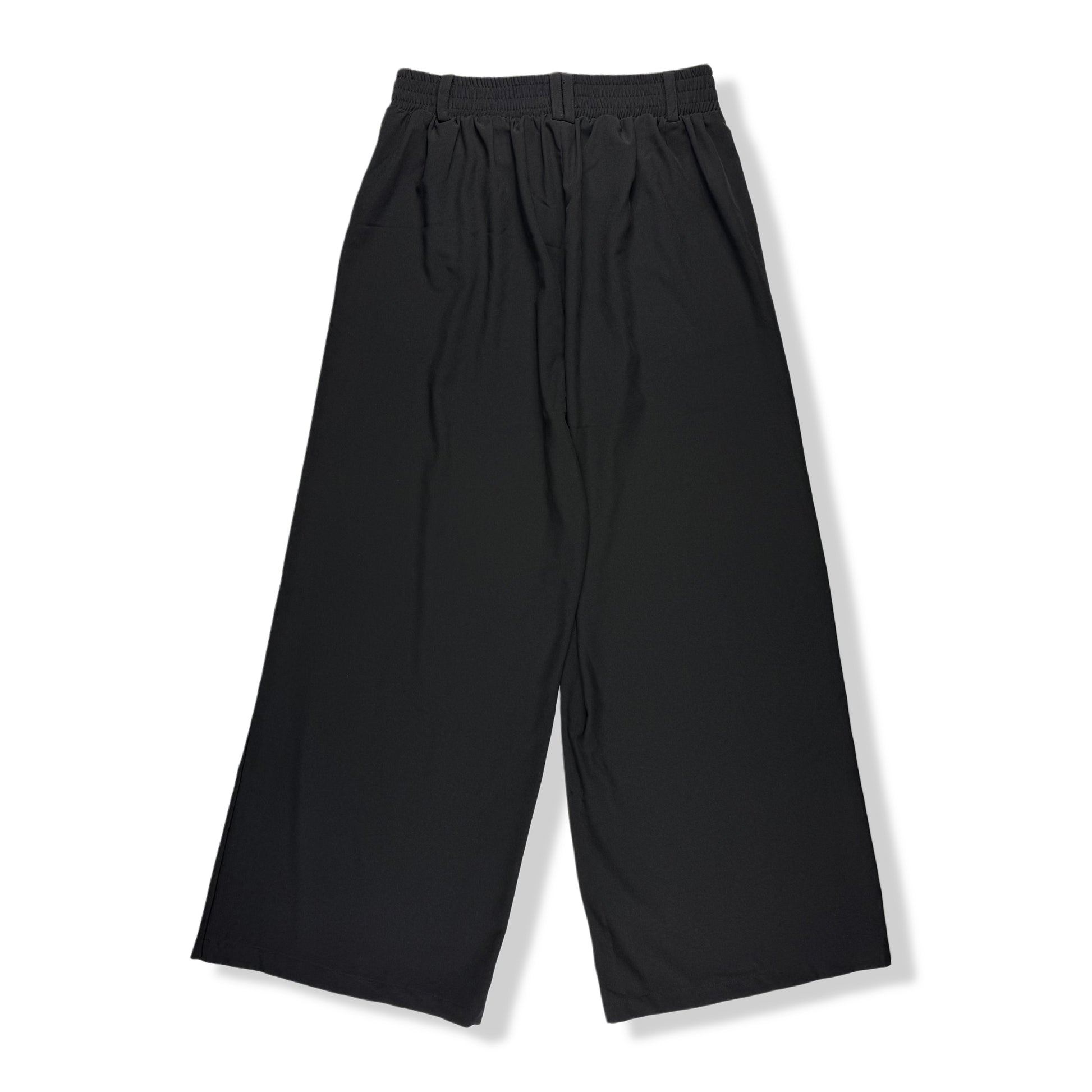 Pantalón negro con wide leg, cintura elástica y aberturas laterales en los bajos. Diseño versátil para uso diario o de oficina, tela ligera que ofrece comodidad en el movimiento.