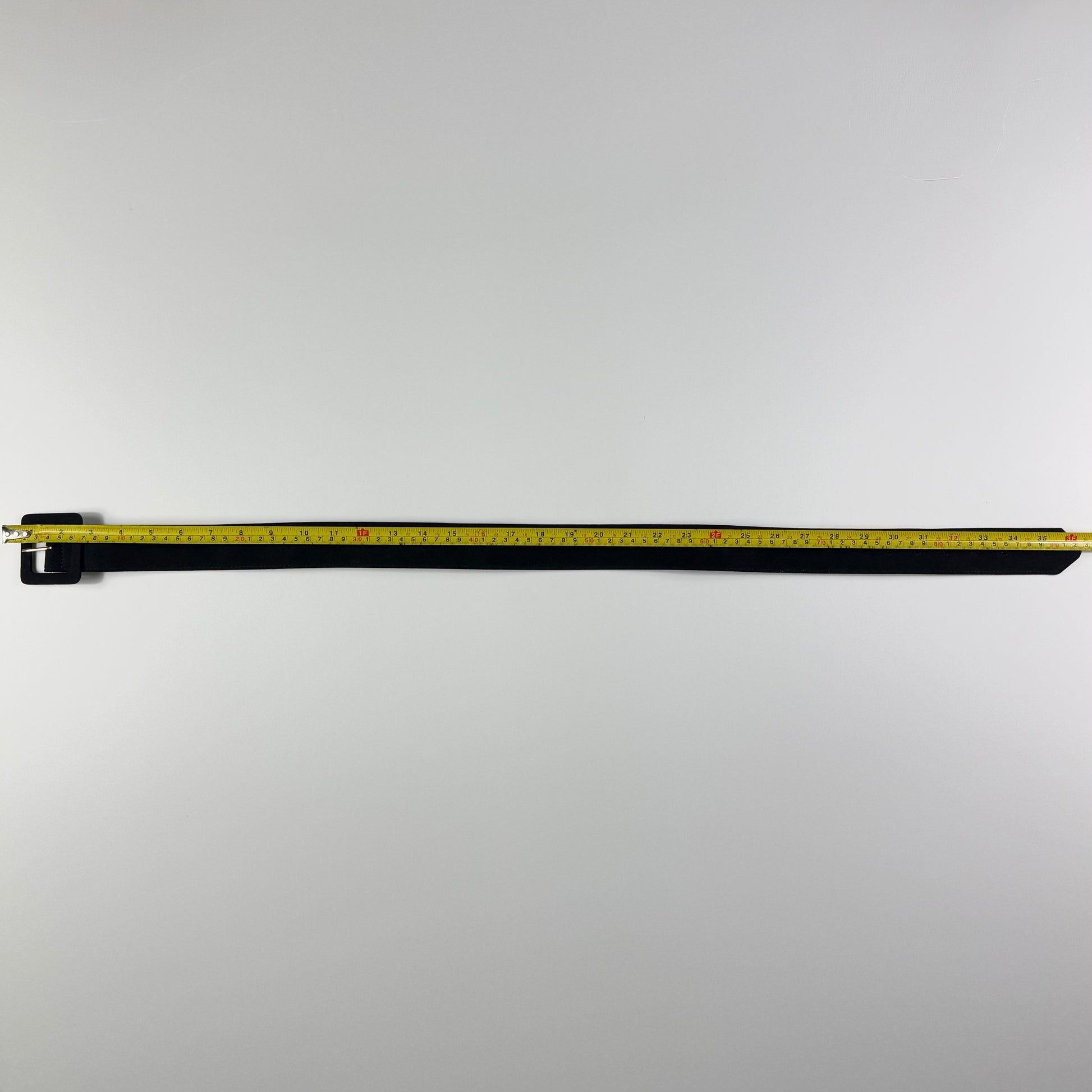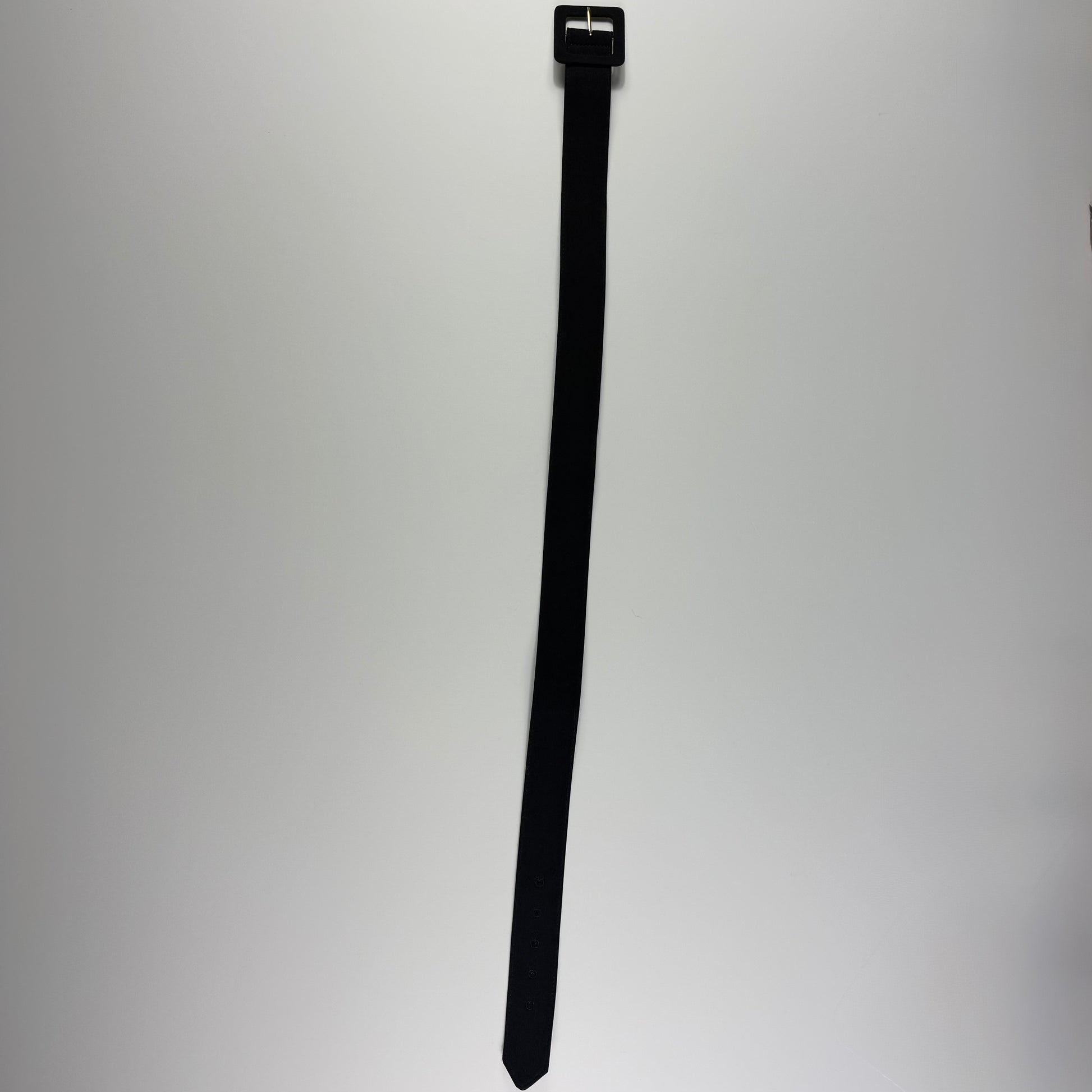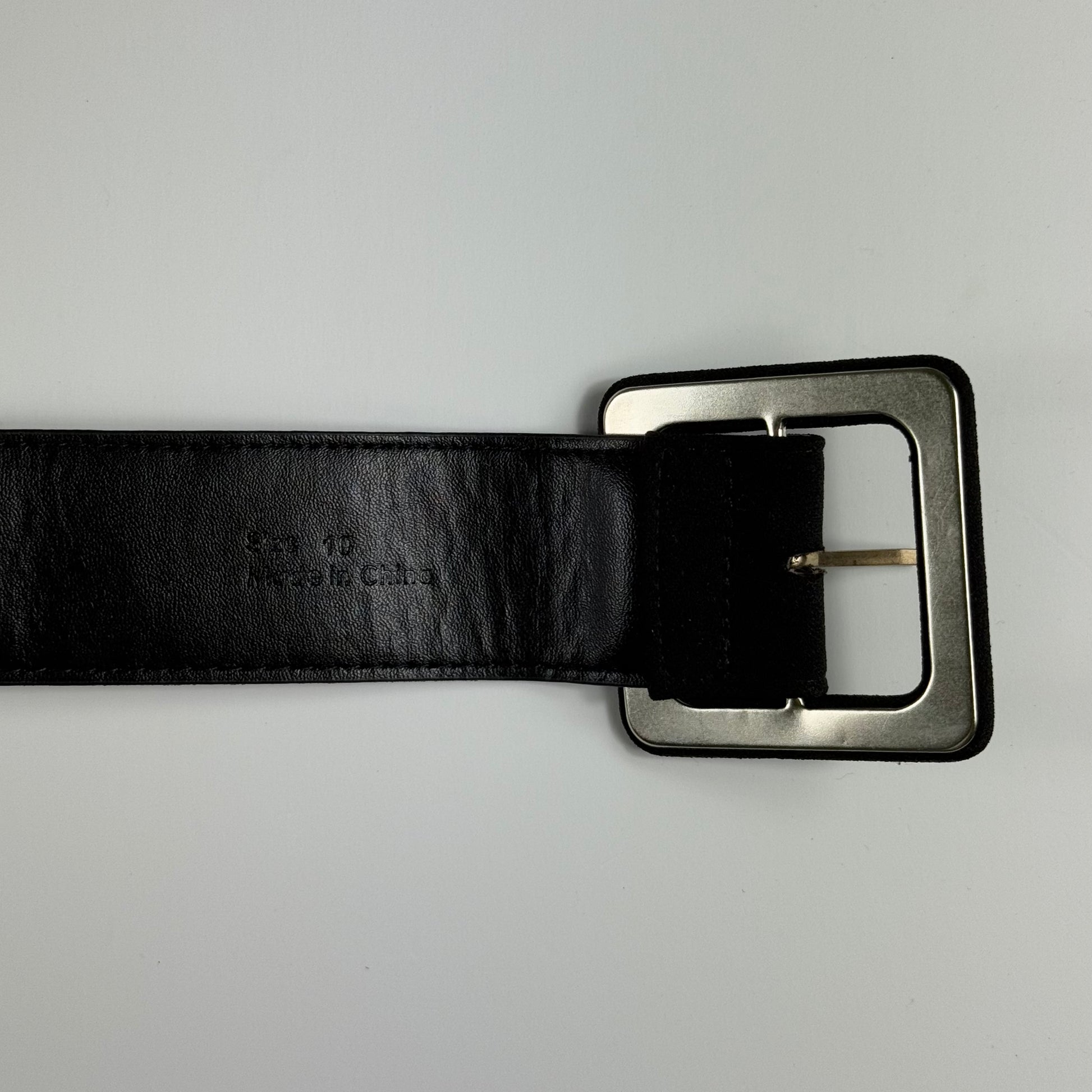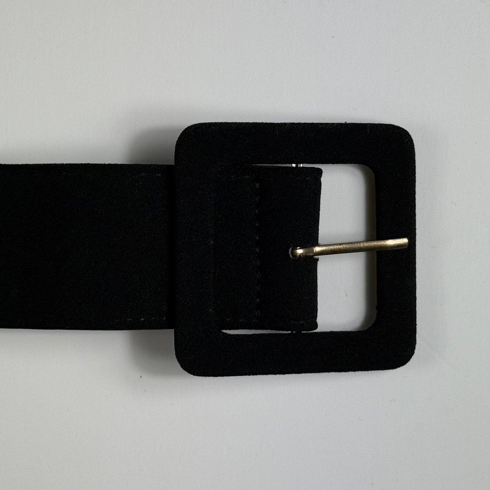 Cinturón negro ancho con textura tipo gamuza por fuera y acabado tipo cuero por dentro. Hebilla rectangular forrada del mismo material. Ideal para marcar cintura en vestidos, blazers o sweaters.