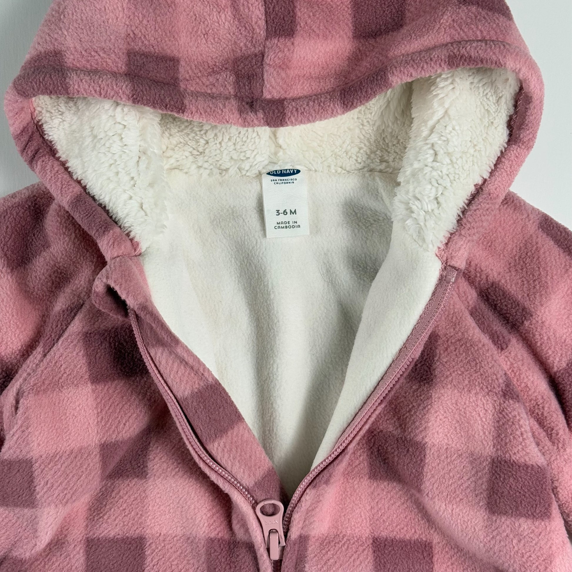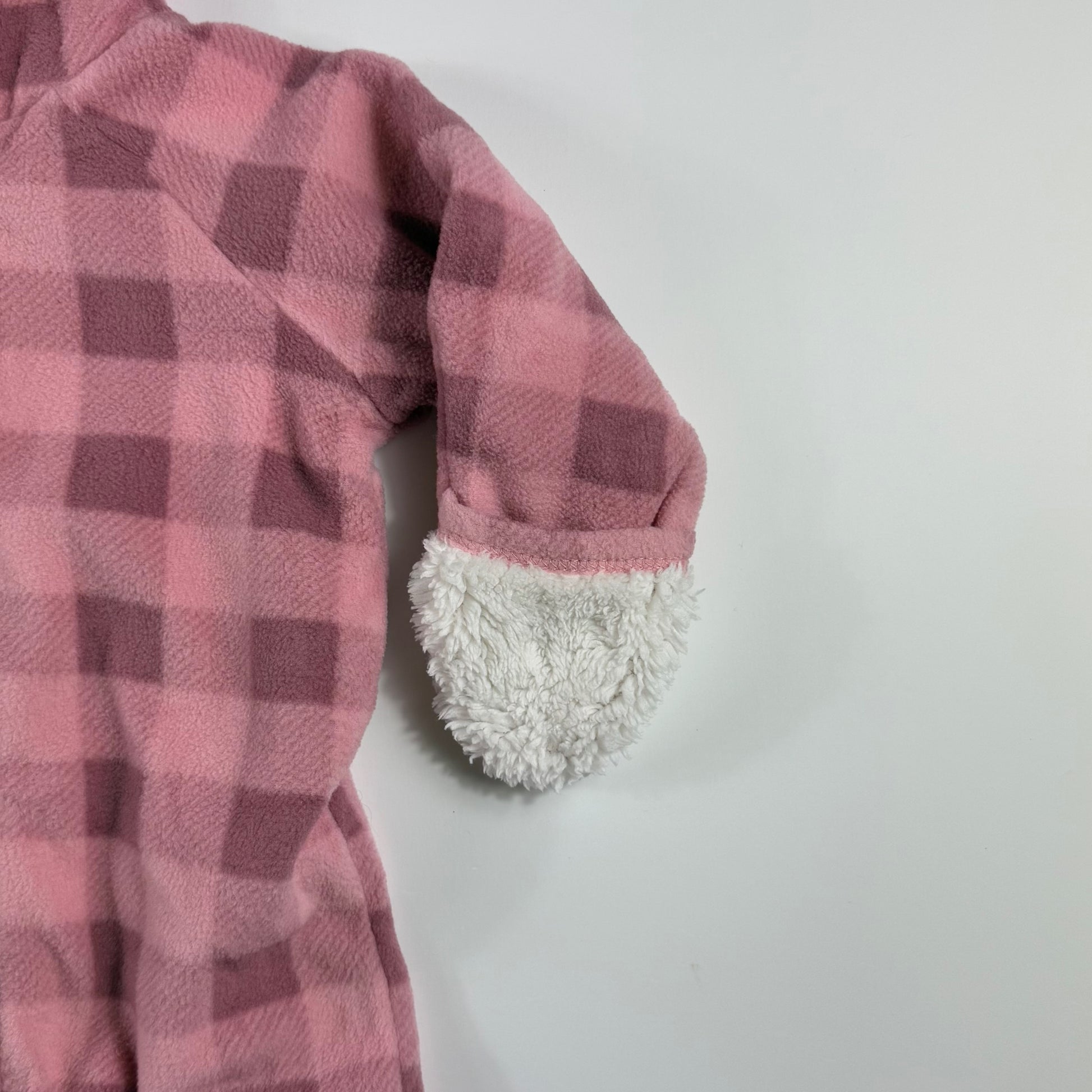 Enterizo abrigado para bebé en tono rosado con estampado a cuadros. Diseño de cuerpo completo con capucha integrada y orejitas decorativas. Interior forrado en material suave tipo borreguito para mayor abrigo y comodidad. Cierre frontal con zipper para facilitar el cambio. Ideal para clima frío o paseos al aire libre.