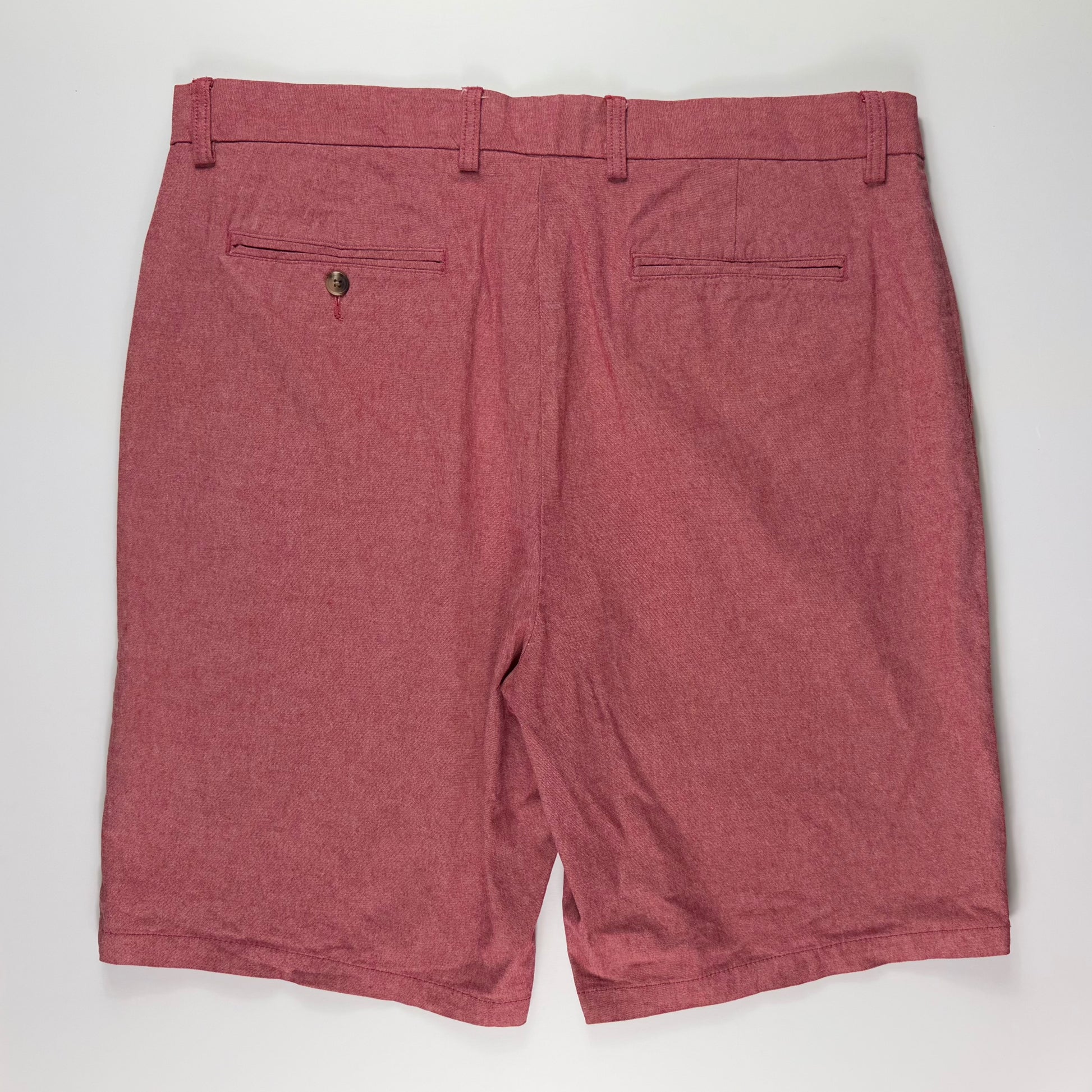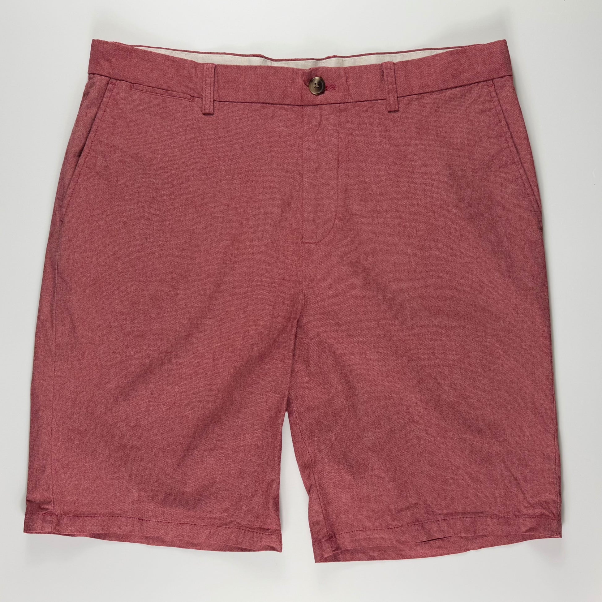 Shorts chino estilo clásico en color rojo vino (burdeos) con textura de lino, ligero y fresco. Cintura con botón y cierre zipper, bolsillos laterales y traseros con botón, corte recto cómodo hasta la rodilla. Ideal para looks casuales elegantes en días calurosos, perfecto para combinar con polos o camisas. Tejido transpirable y versátil para uso diario o salidas informales.