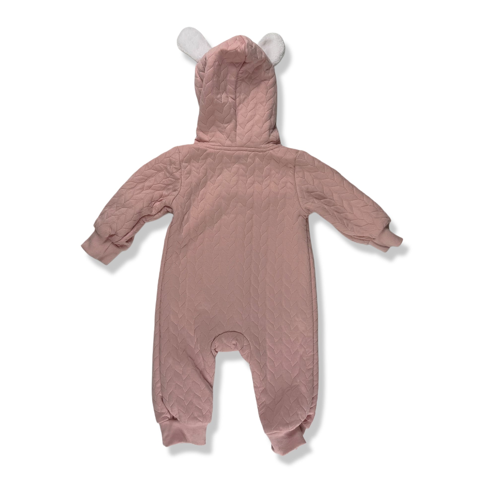 Mono acolchado rosado con capucha y orejitas en felpa, botones frontales estilo madera, textura tipo tejido en relieve y puños elásticos. Interior suave y cómodo, ideal para mantener al bebé abrigado.