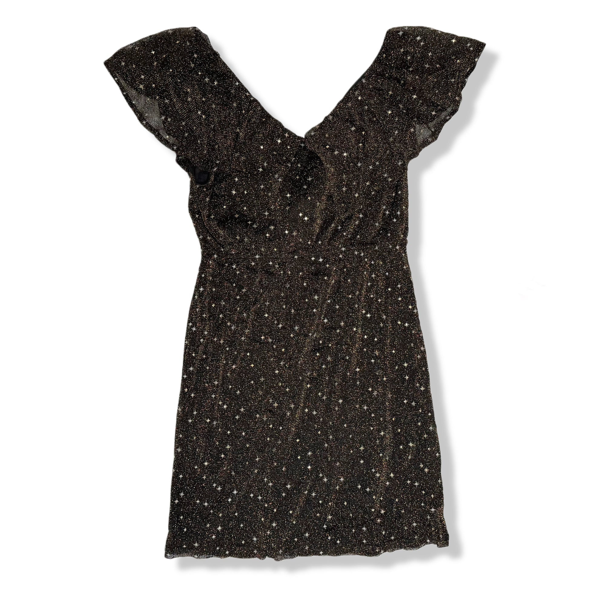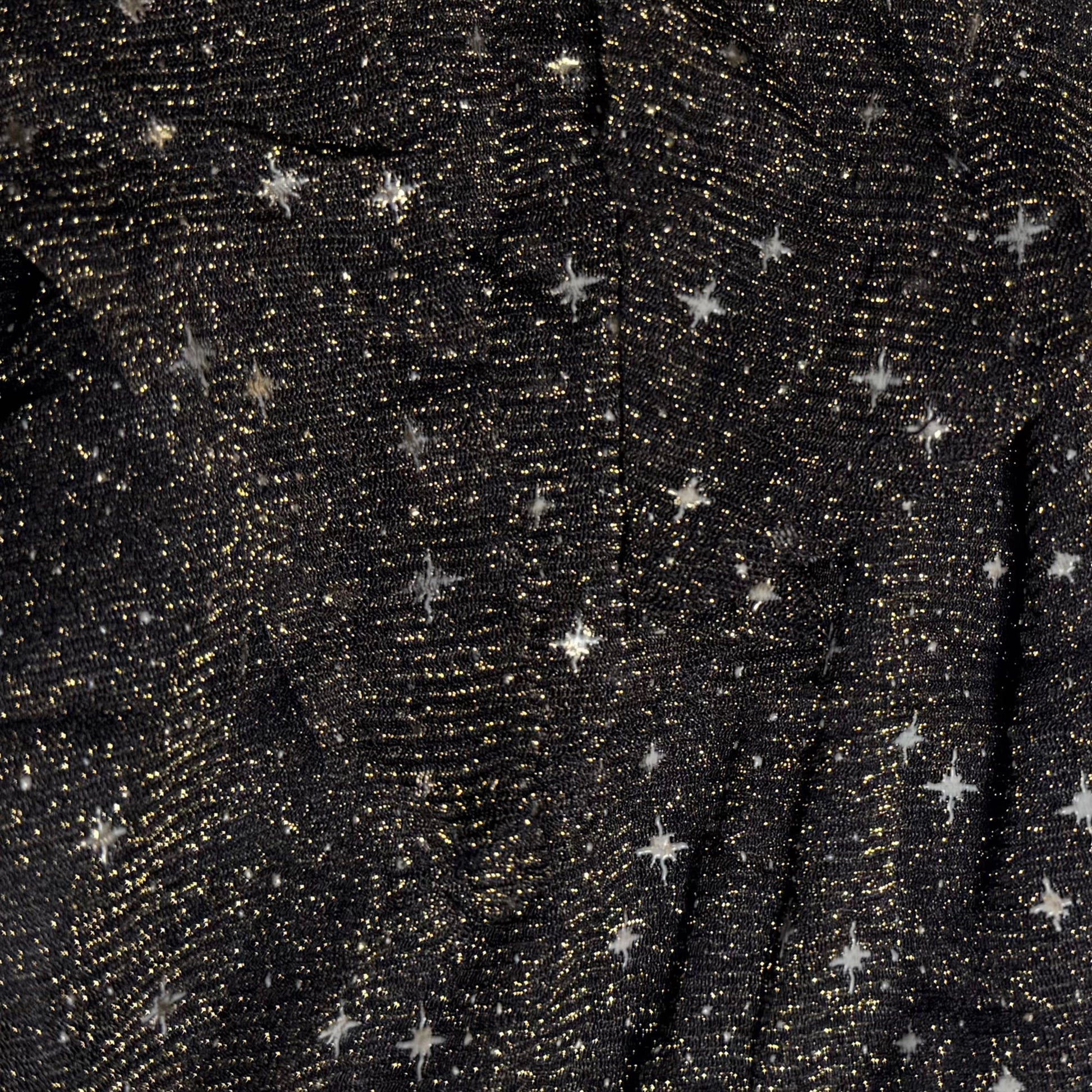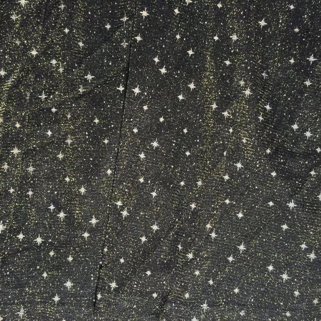 Vestido negro con tejido ligeramente brillante y print de estrellas. Diseño femenino con escote en V y mangas cortas con caída suave. Ideal para salidas de noche, eventos casuales o cenas donde quieres algo especial. Tela liviana y cómoda, con buena fluidez.