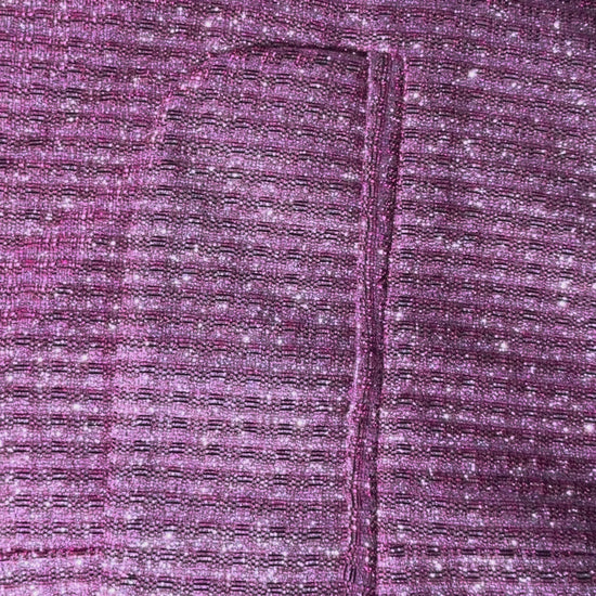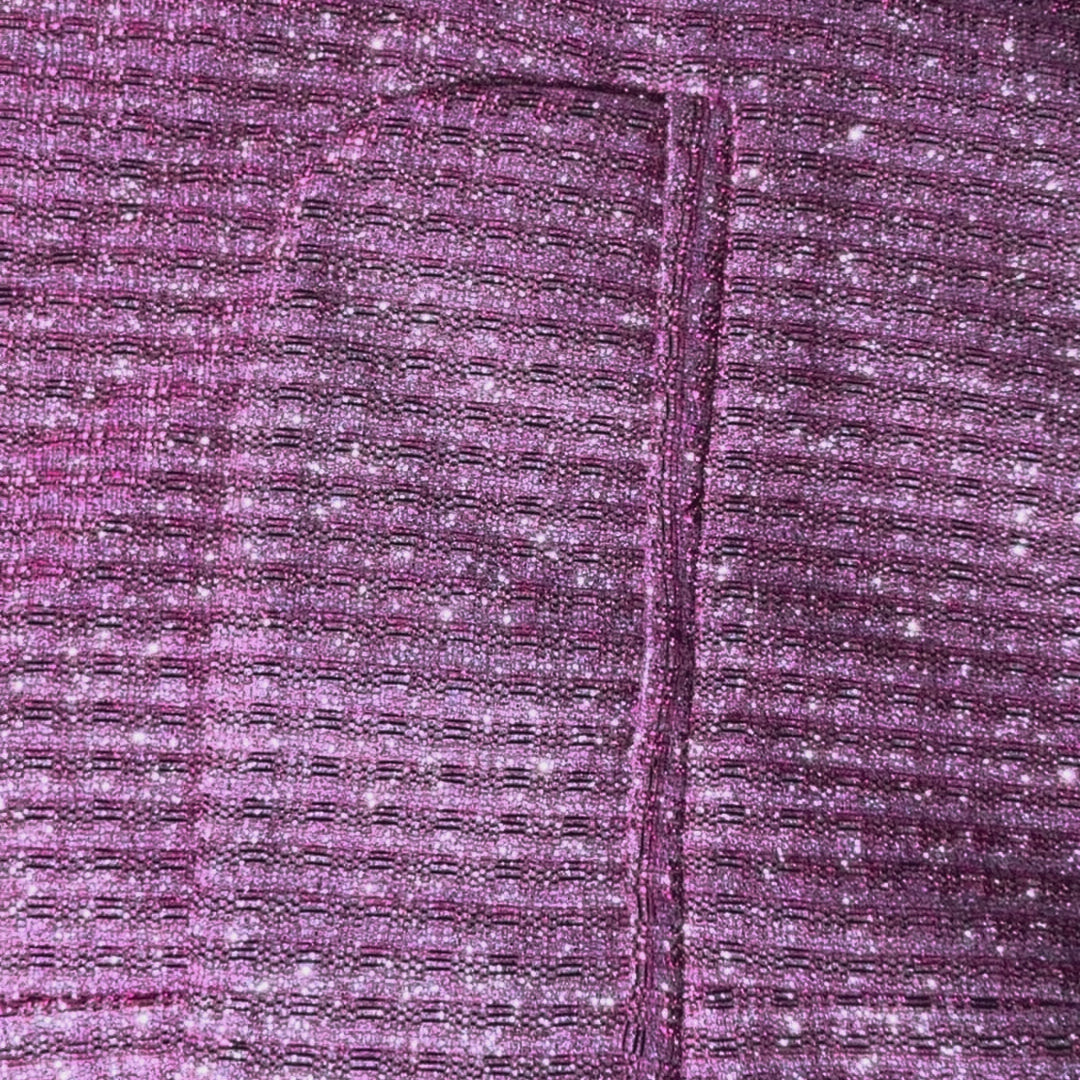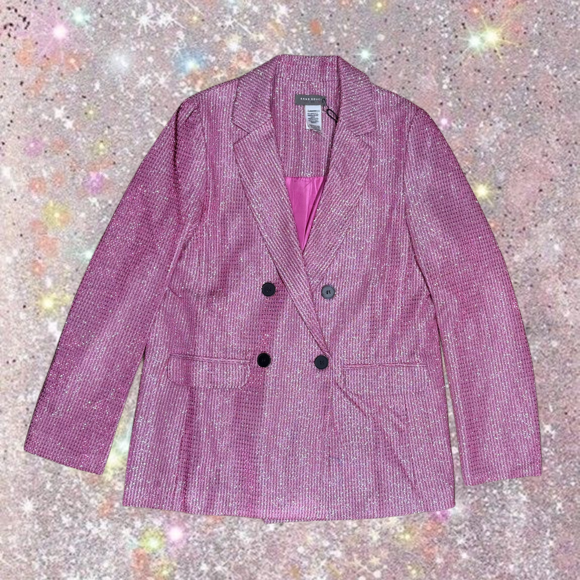 Blazer tipo statement con acabado metalizado/brillante rosado y textura tipo rejilla. Corte estructurado, solapas clásicas y doble botonadura.