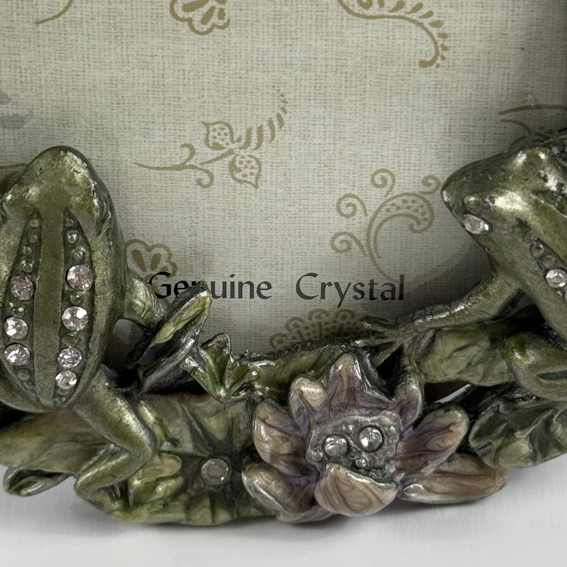 Marco decorativo ovalado con diseño de ranas, flores y cristales incrustados. Ideal para mesa, repisa o tocador. Tamaño interior 3.5" x 5".