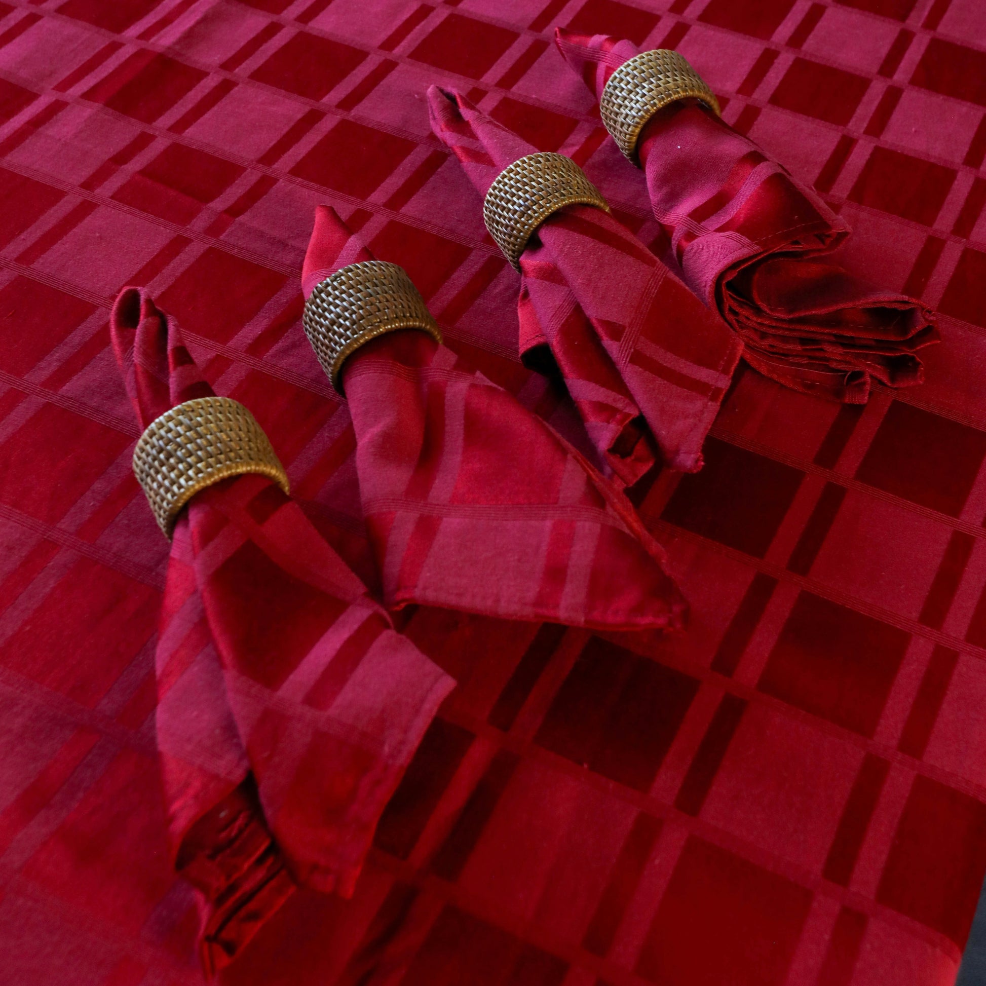 Set de mantel rectangular con 4 servilletas en color rojo, acabado satinado y diseño de cuadros tipo damasco. Ideal para cenas, reuniones familiares o montar una mesa bonita sin complicarte. Incluye servilletas a juego para que todo combine perfecto.