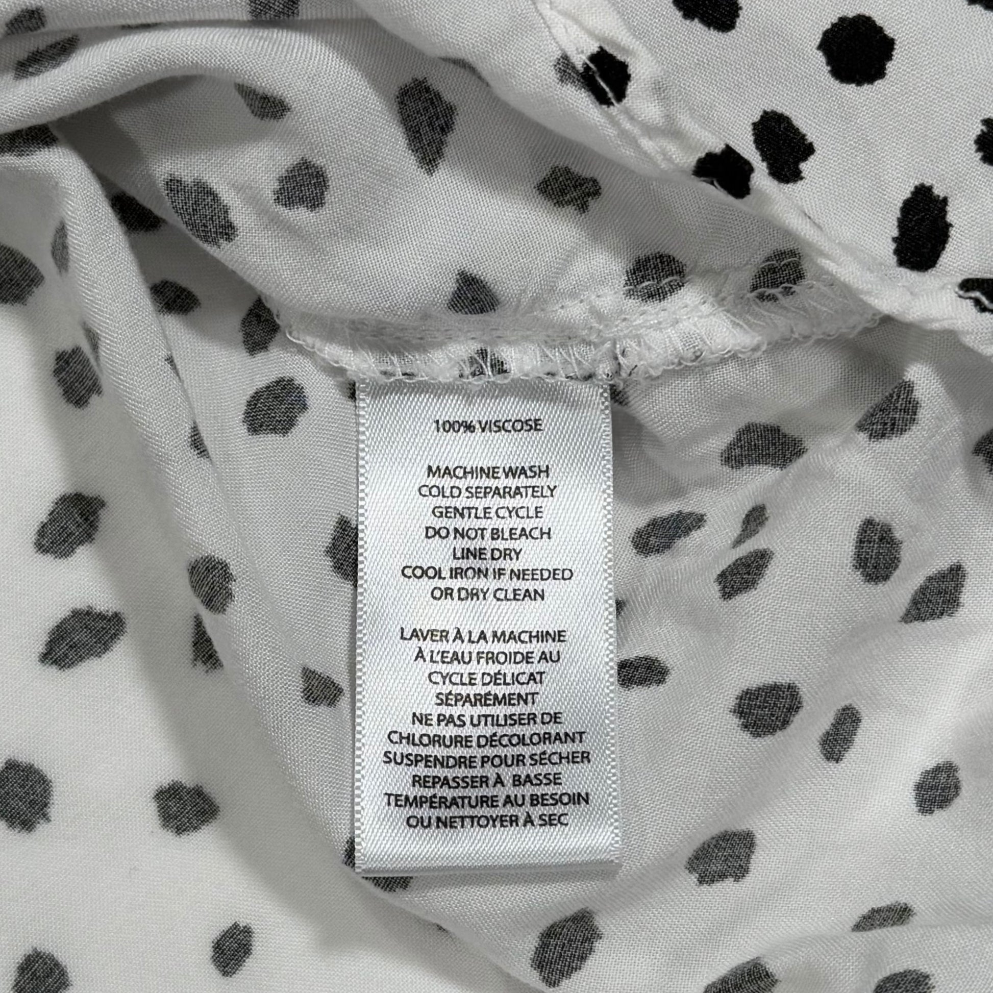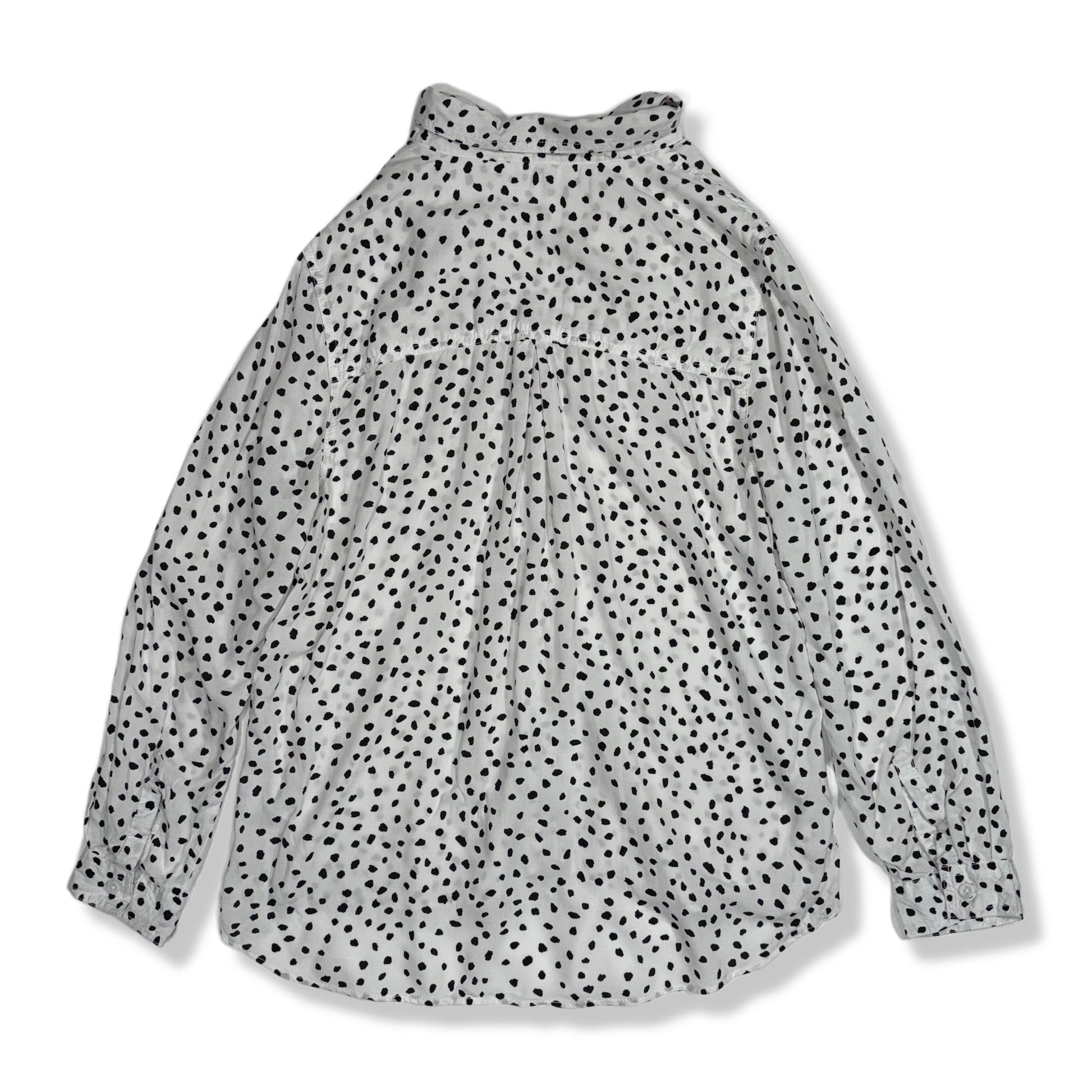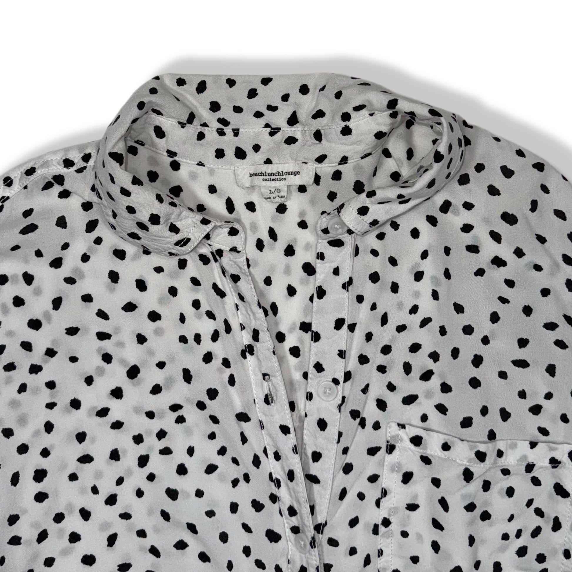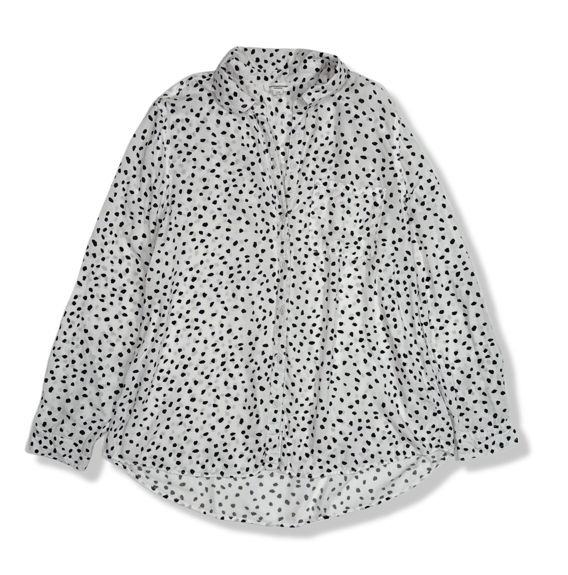 Blusa tipo camisa blanca con estampado negro irregular estilo dalmata. Diseño con botones frontales, cuello clásico y bolsillo en el pecho. Corte amplio con caída ligera y ruedo más largo en la parte trasera. Tela fluida y fresca, ideal para clima cálido o para usar abierta sobre un top básico.