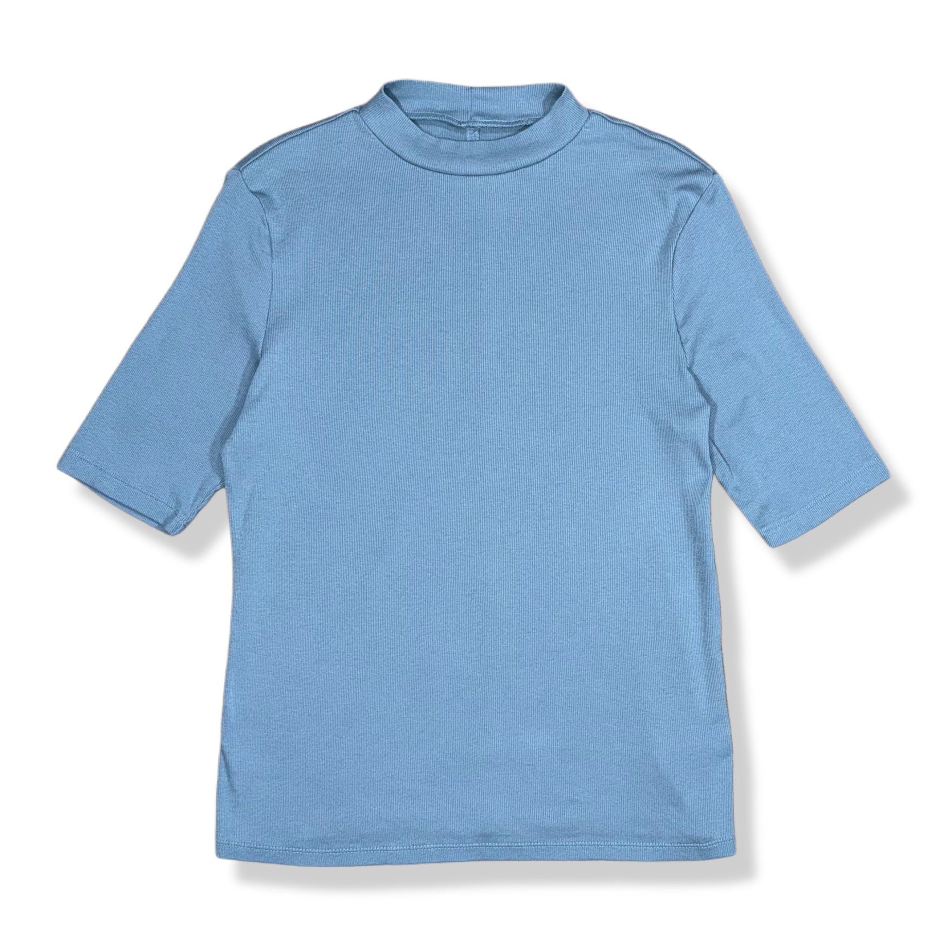 Blusa color azul claro, de tejido suave y elástico, con cuello medio y mangas 3/4. Tiene un diseño limpio y cómodo, ideal para el día a día o para combinar con pantalones, jeans o faldas. La tela es ligera, agradable al tacto y mantiene bien la forma.