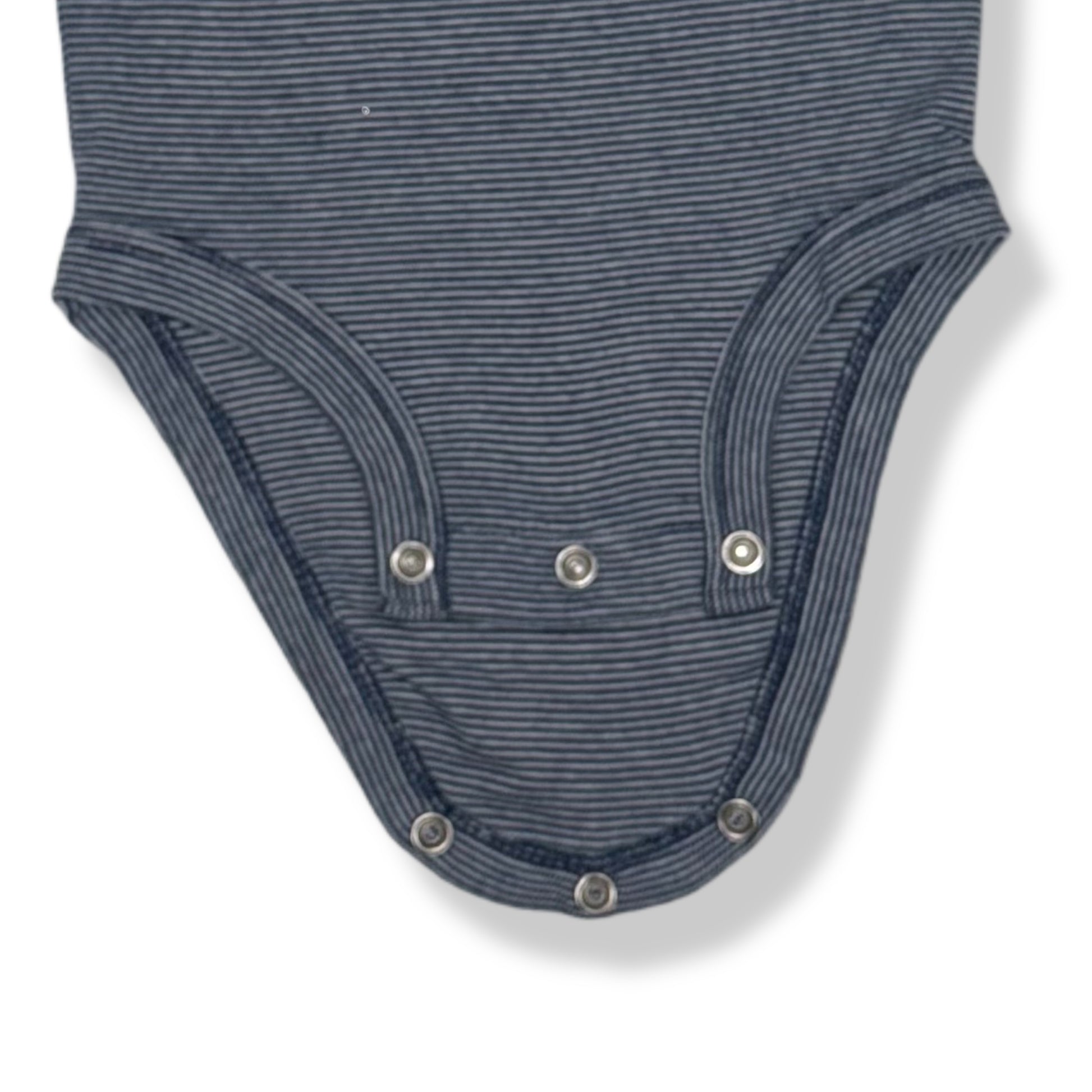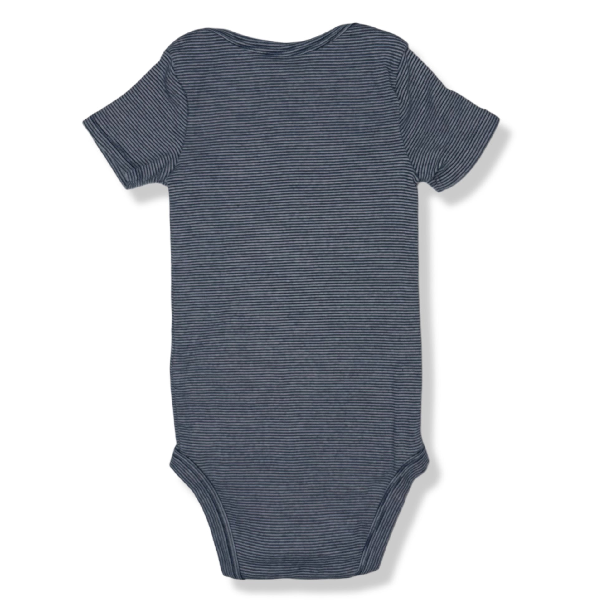 Enterizo de bebé en color azul marino con rayas finas, diseño clásico de manga corta y cuello redondo. Confeccionado en algodón suave y cómodo, ideal para el uso diario. Cierre inferior con broches a presión para facilitar el cambio