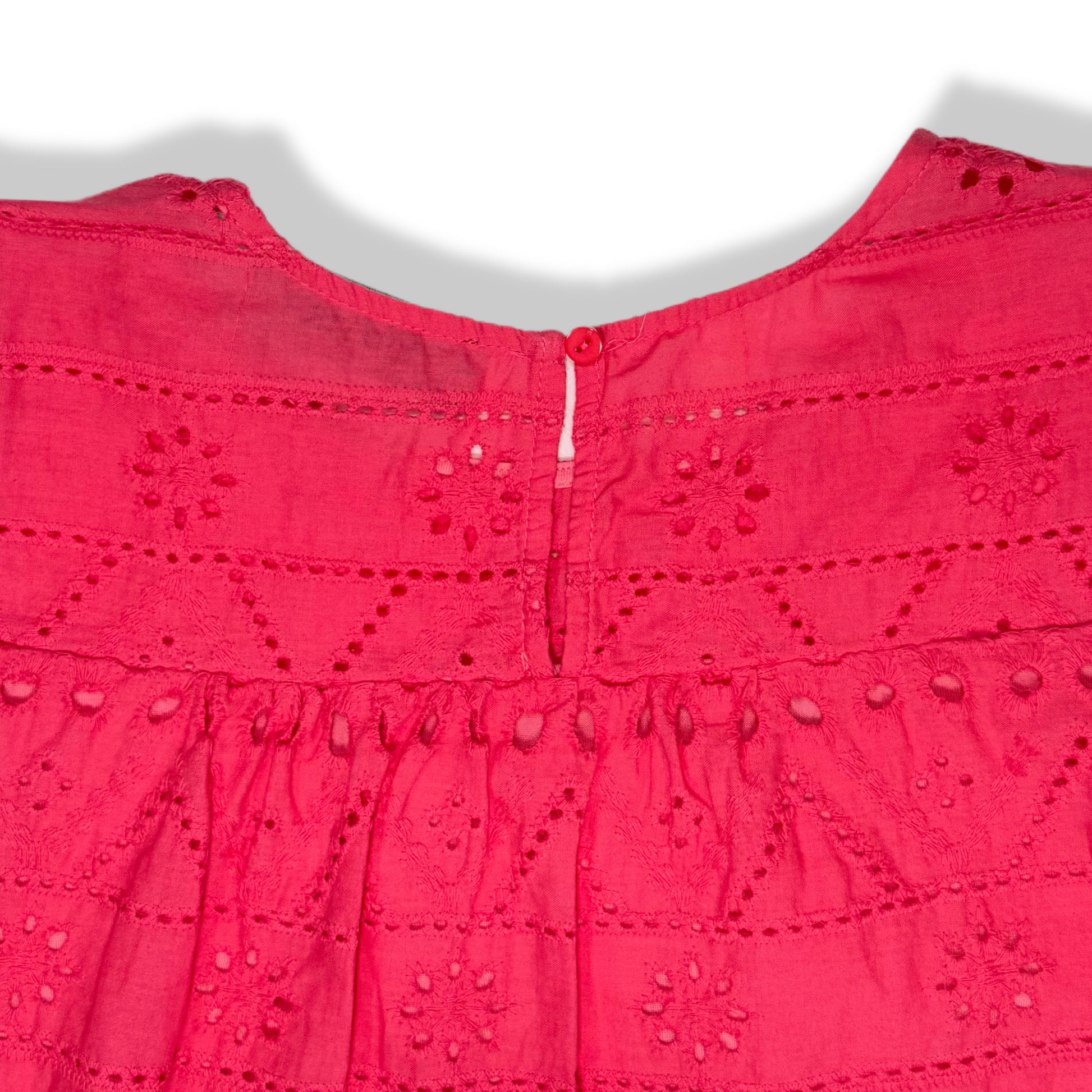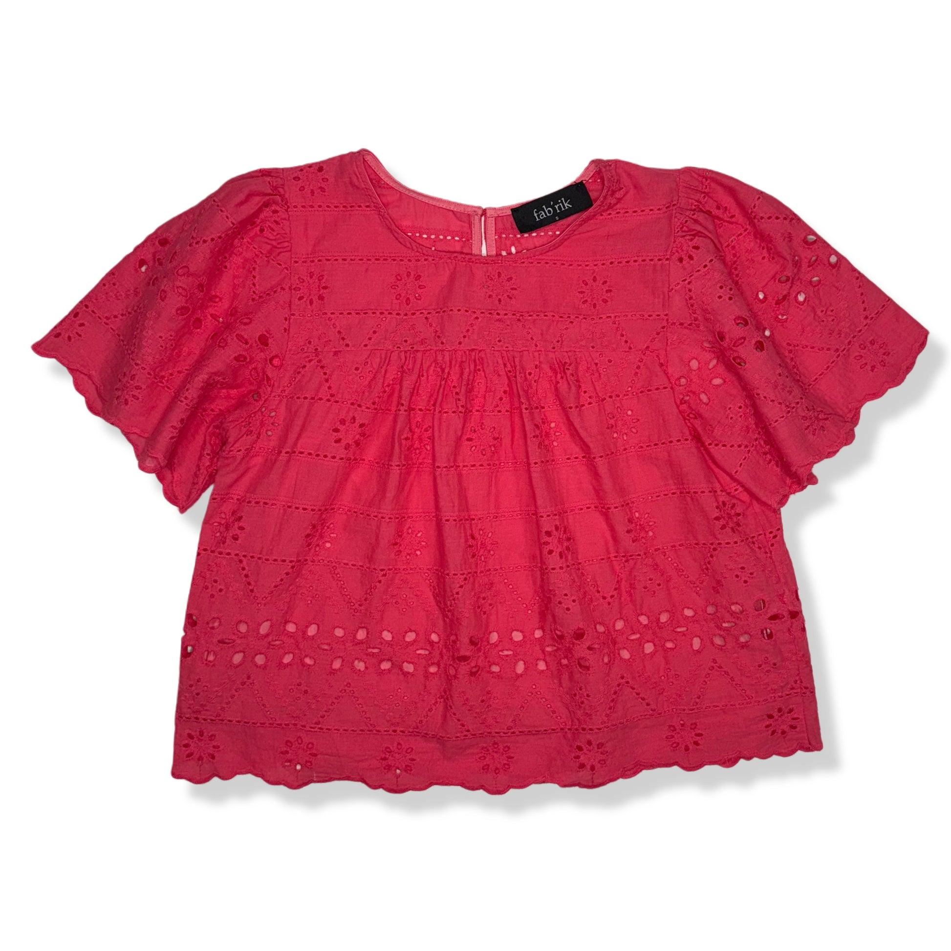 Blusa fucsia de algodón con bordado tipo eyelet y mangas cortas abullonadas. Silueta suelta con corte bajo el busto, detalle calado y cierre posterior con botón. Una pieza fresca, femenina y fácil de combinar para el día a día o salidas especiales.