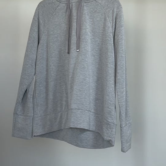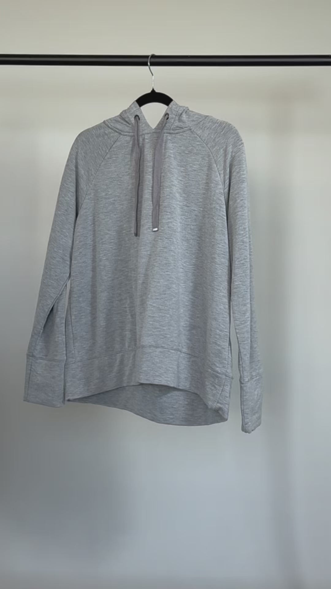 Hoodie gris de estilo deportivo, con capucha fija y cordones ajustables. Diseño de corte recto, mangas largas y terminación clásica en el bajo. Tejido suave con buena elasticidad, ideal para uso diario y actividades casuales.