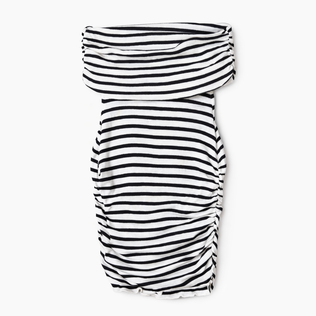 Top de rayas en blanco y negro, con cuello tipo drapeado amplio y fruncido lateral que estiliza la silueta. Diseño ajustado, suave al tacto y con buena caída, ideal para looks casuales o para elevar un outfit básico.