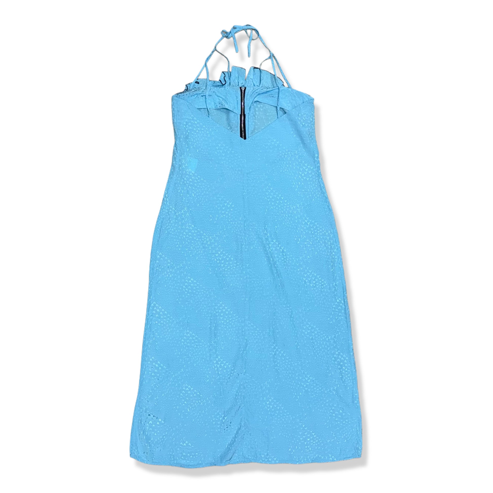 Vestido midi azul con escote halter ajustable, detalle fruncido en el pecho y textura geométrica en todo el tejido. Silueta recta y ligera.