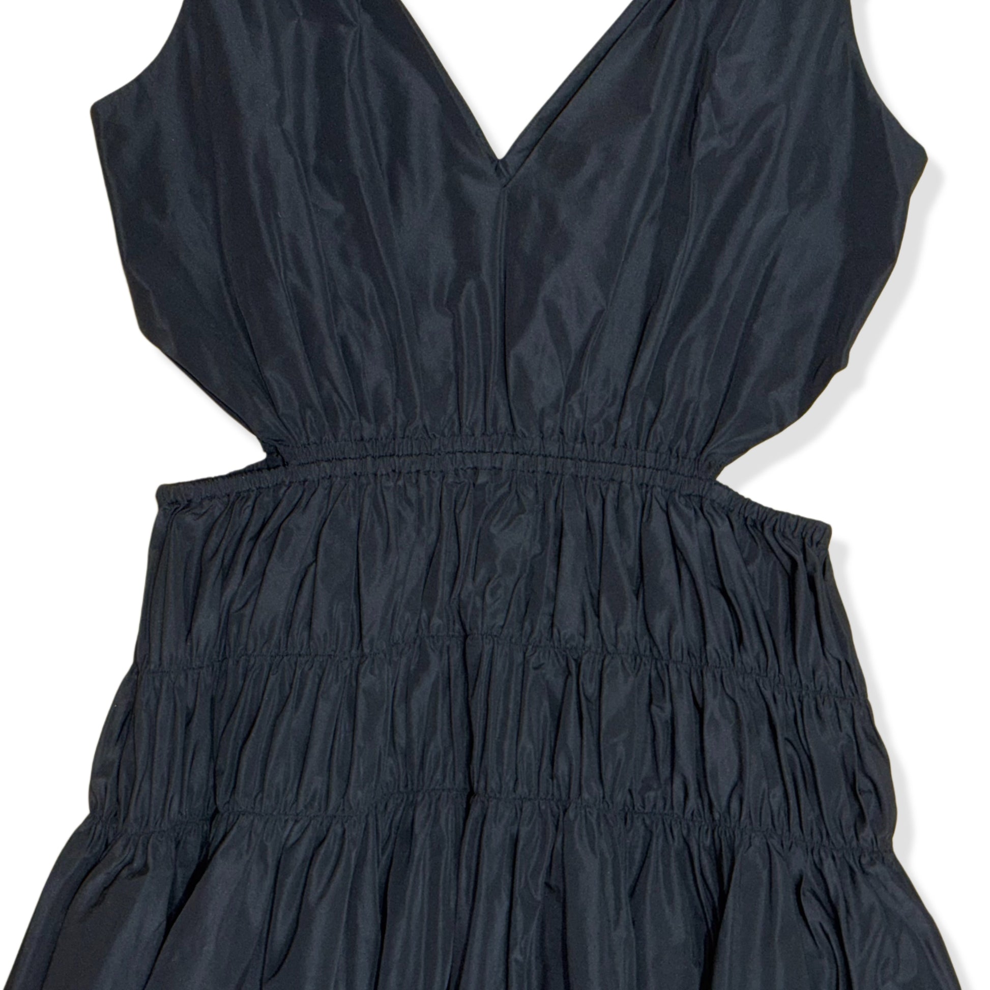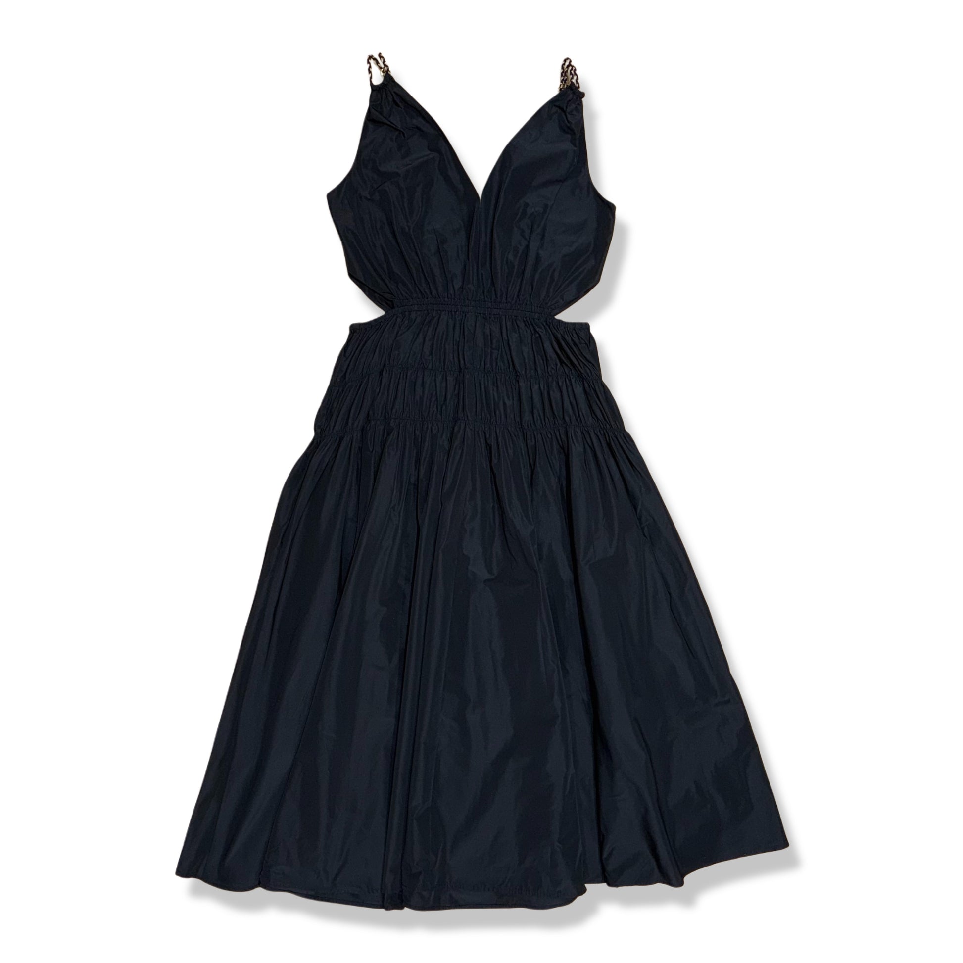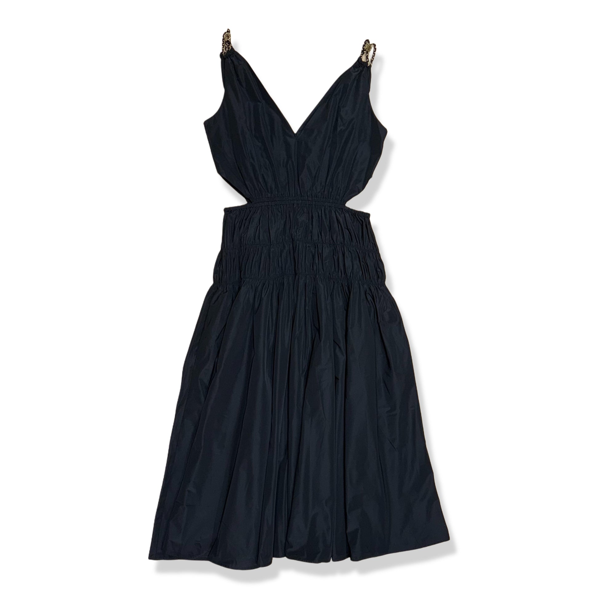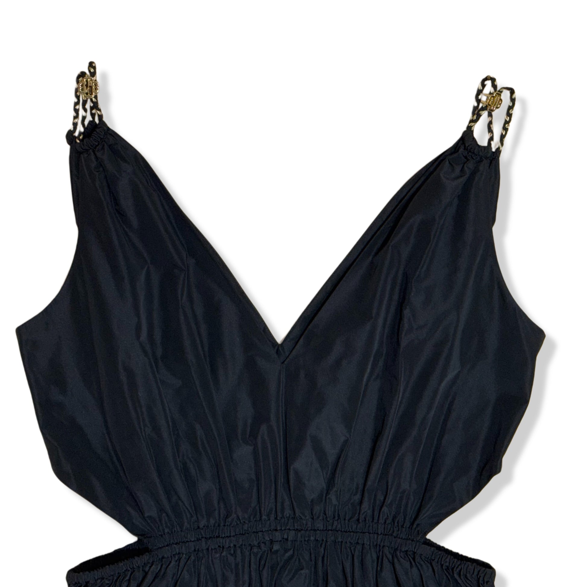 Vestido midi negro con escote en V, tirantes cadena bicolor y cintura fruncida con aberturas laterales. Falda amplia con caída ligera y tejido técnico que aporta un look moderno y sofisticado.