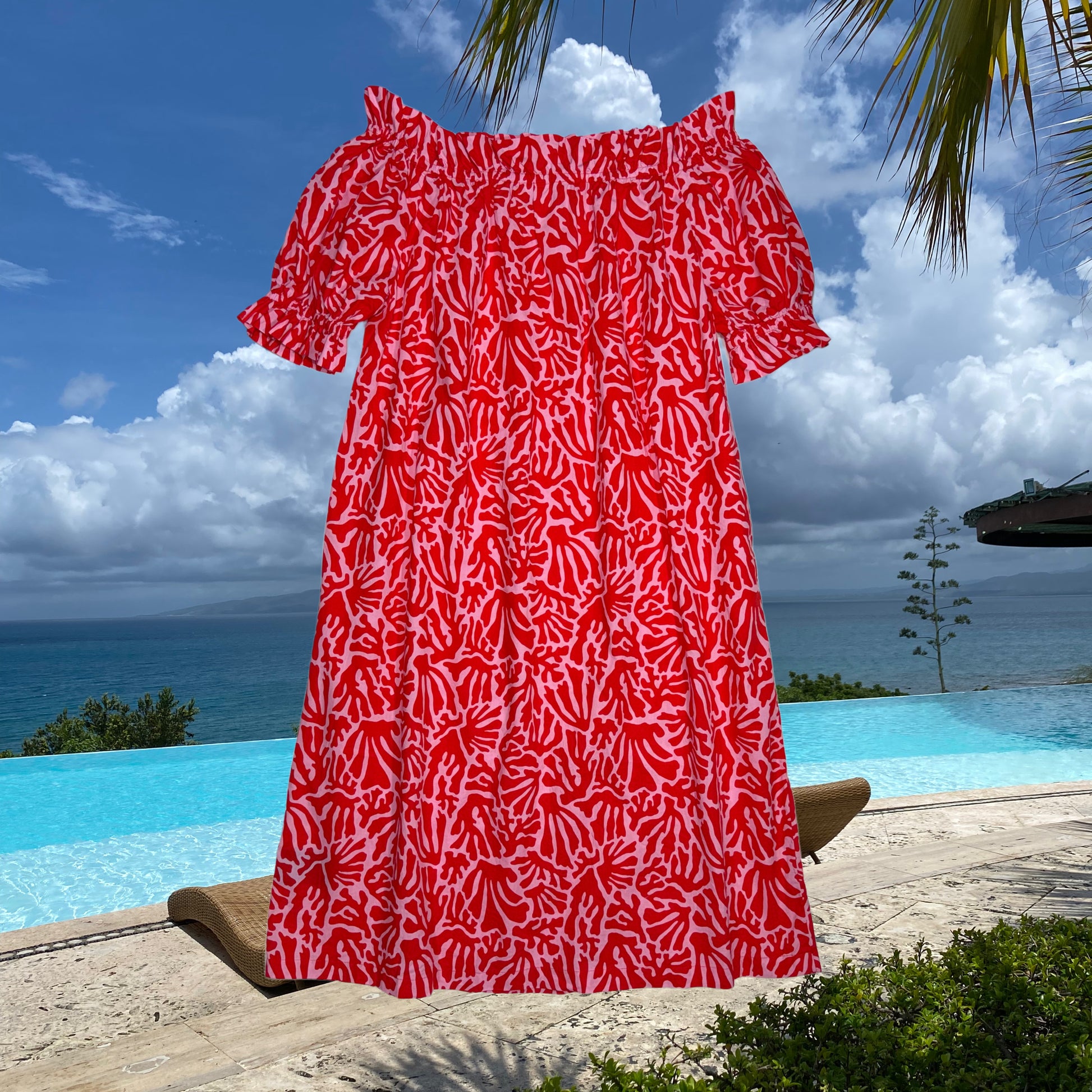 Este vestido 100% algodón con estampado en tonos rojos y rosados es el statement perfecto para días soleados. Fresco, divertido y con mangas fruncidas, te acompañará desde un paseo informal hasta un almuerzo con amigas.