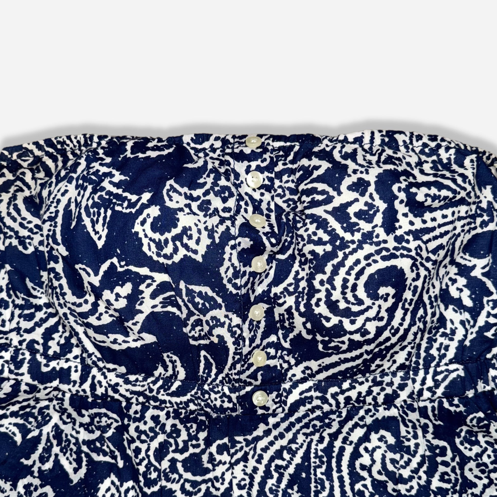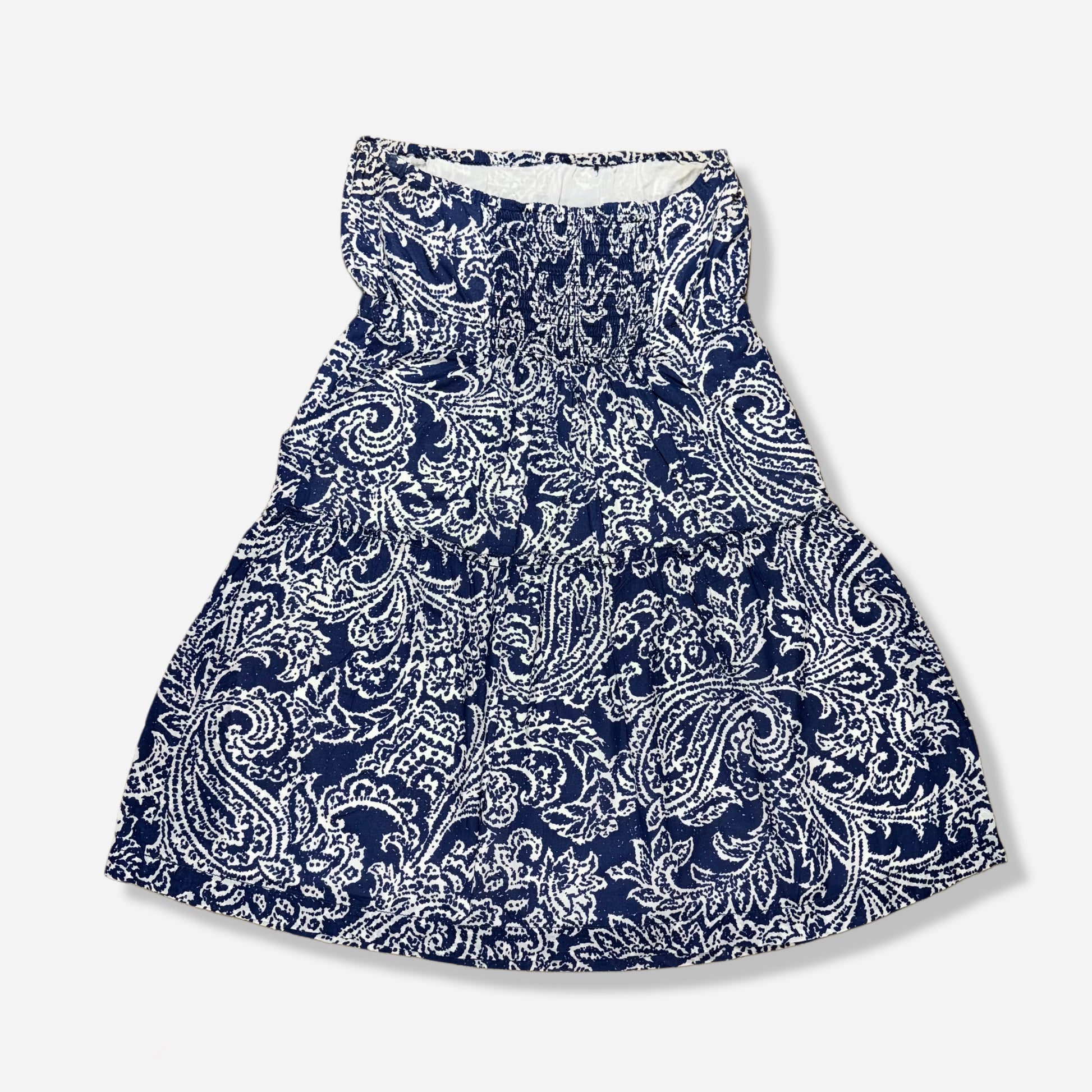 Este vestido strapless con estampado paisley en azul y blanco fluye con gracia y frescura en cada movimiento.